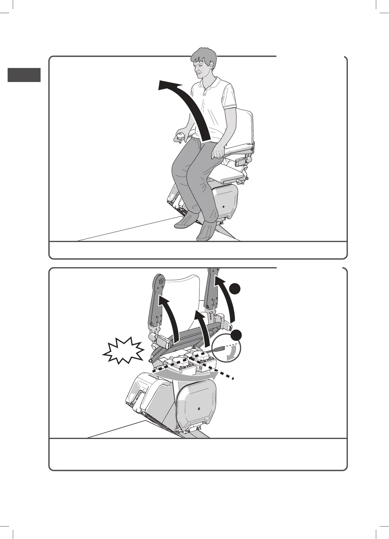 Relevez les accoudoirs et l'assise vers le haut {A}. Poussez la poignée vers le bas