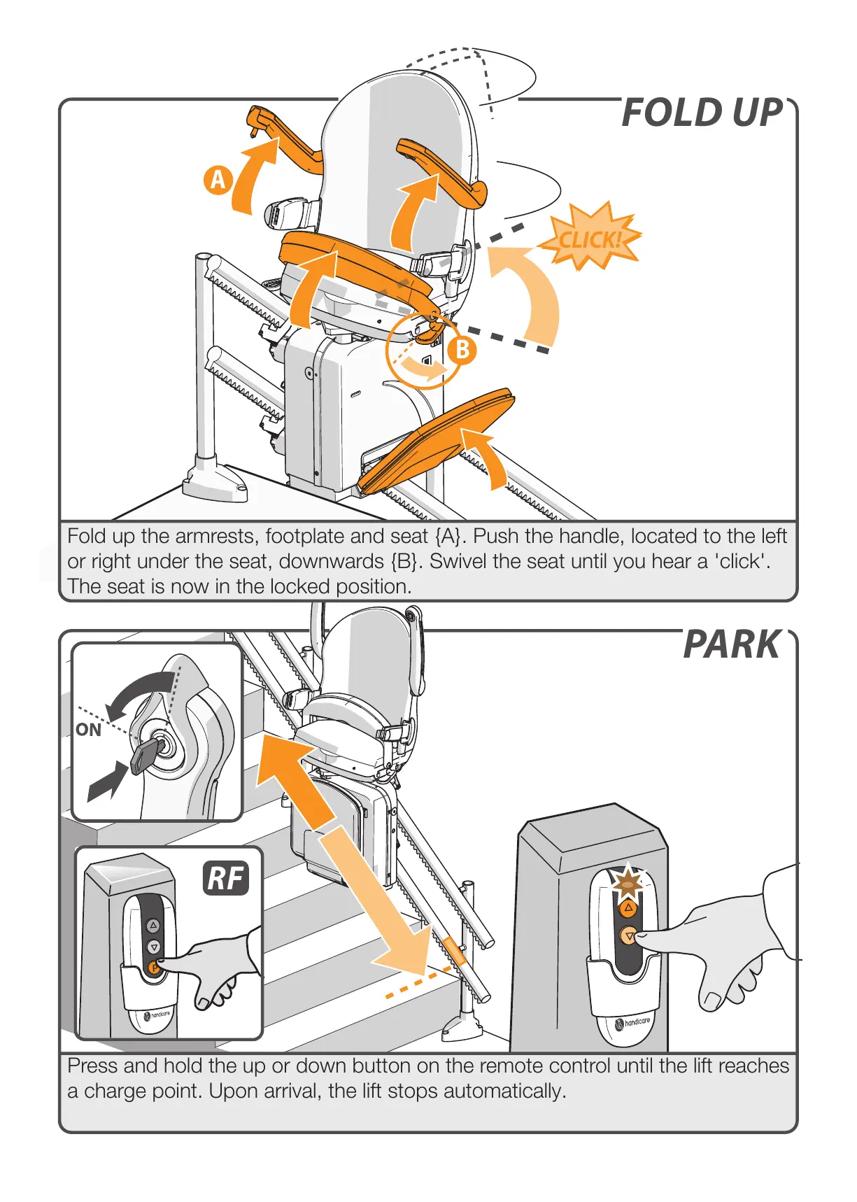 Fold up the armrests, footplate and seat {A}. Push the handle, located to the left