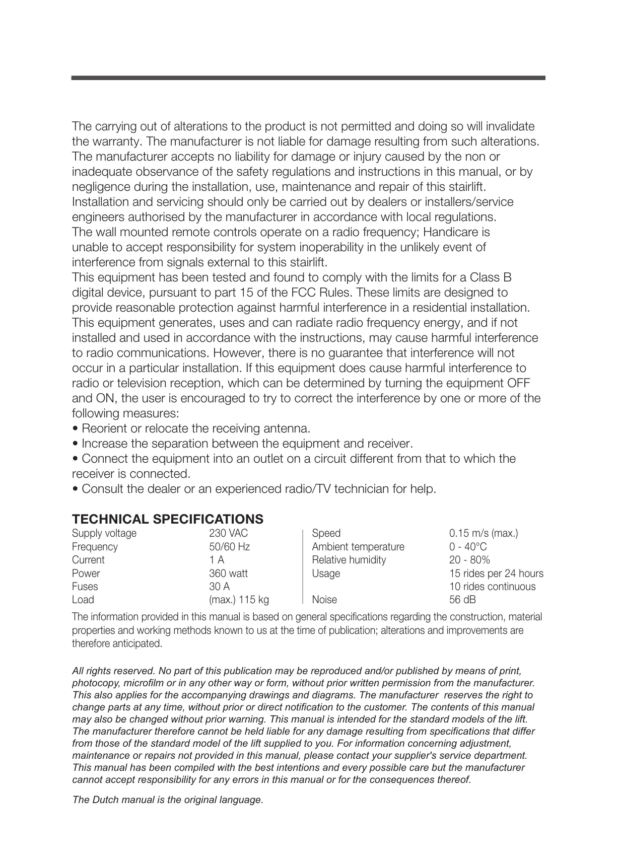may also be changed without prior warning. This manual is intended for the standard models of the lift.