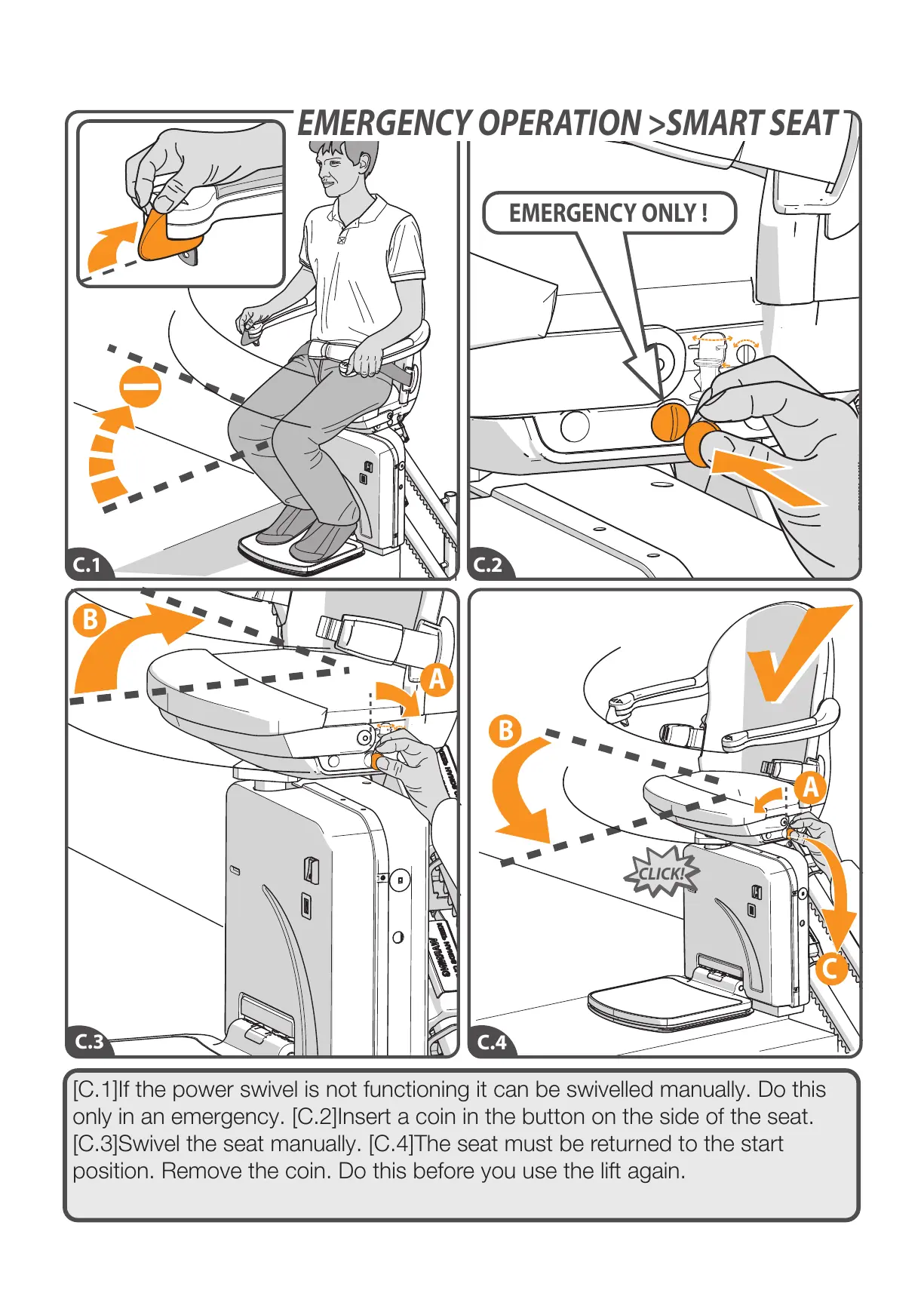 only in an emergency. [C.2]Insert a coin in the button on the side of the seat.