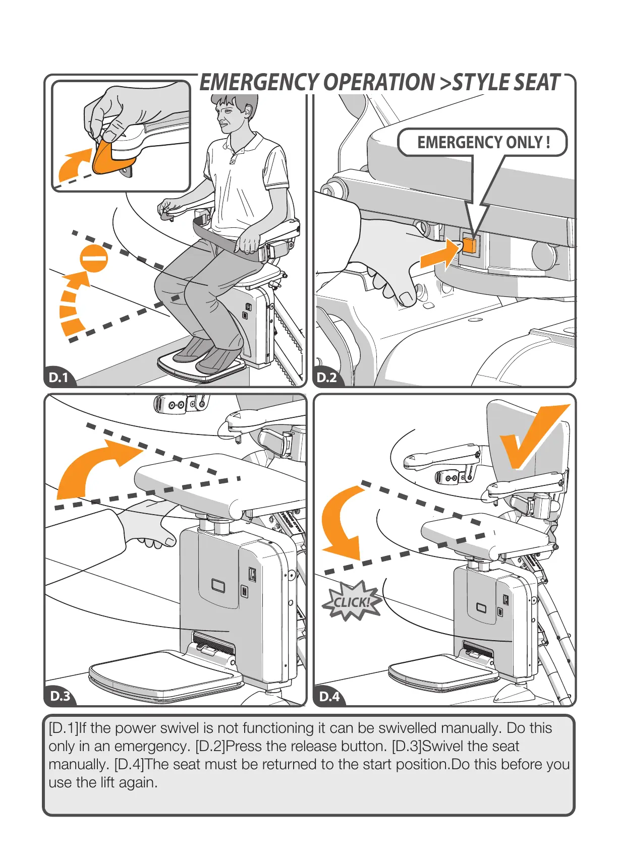 only in an emergency. [D.2]Press the release button. [D.3]Swivel the seat
