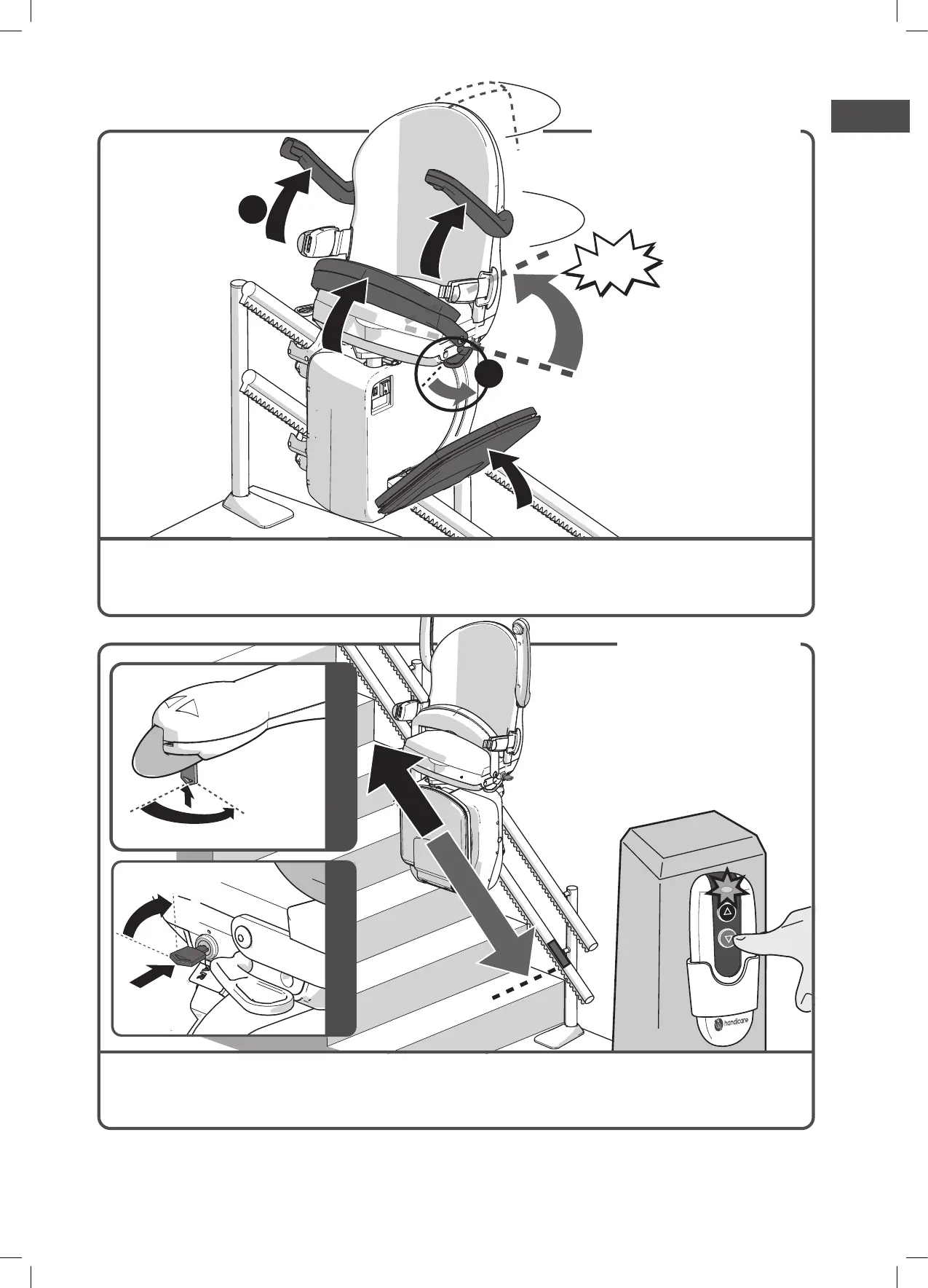Klap de armleuningen, voetenplank en de stoelzitting op {A}. Druk de hendel links of