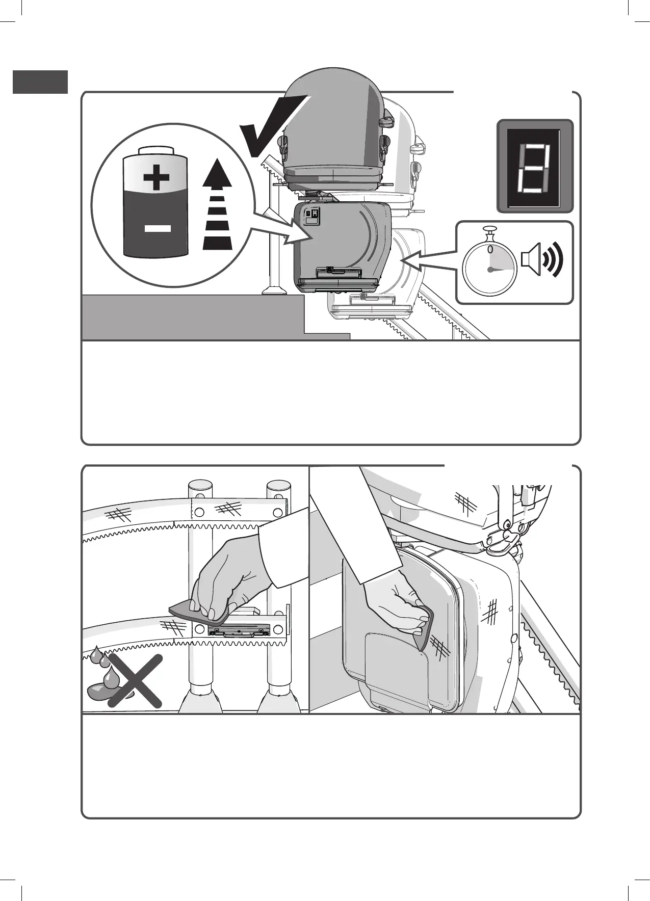 Reinig de traplift regelmatig. Gebruik niet te veel water. Gebruik geen zuurhoudende