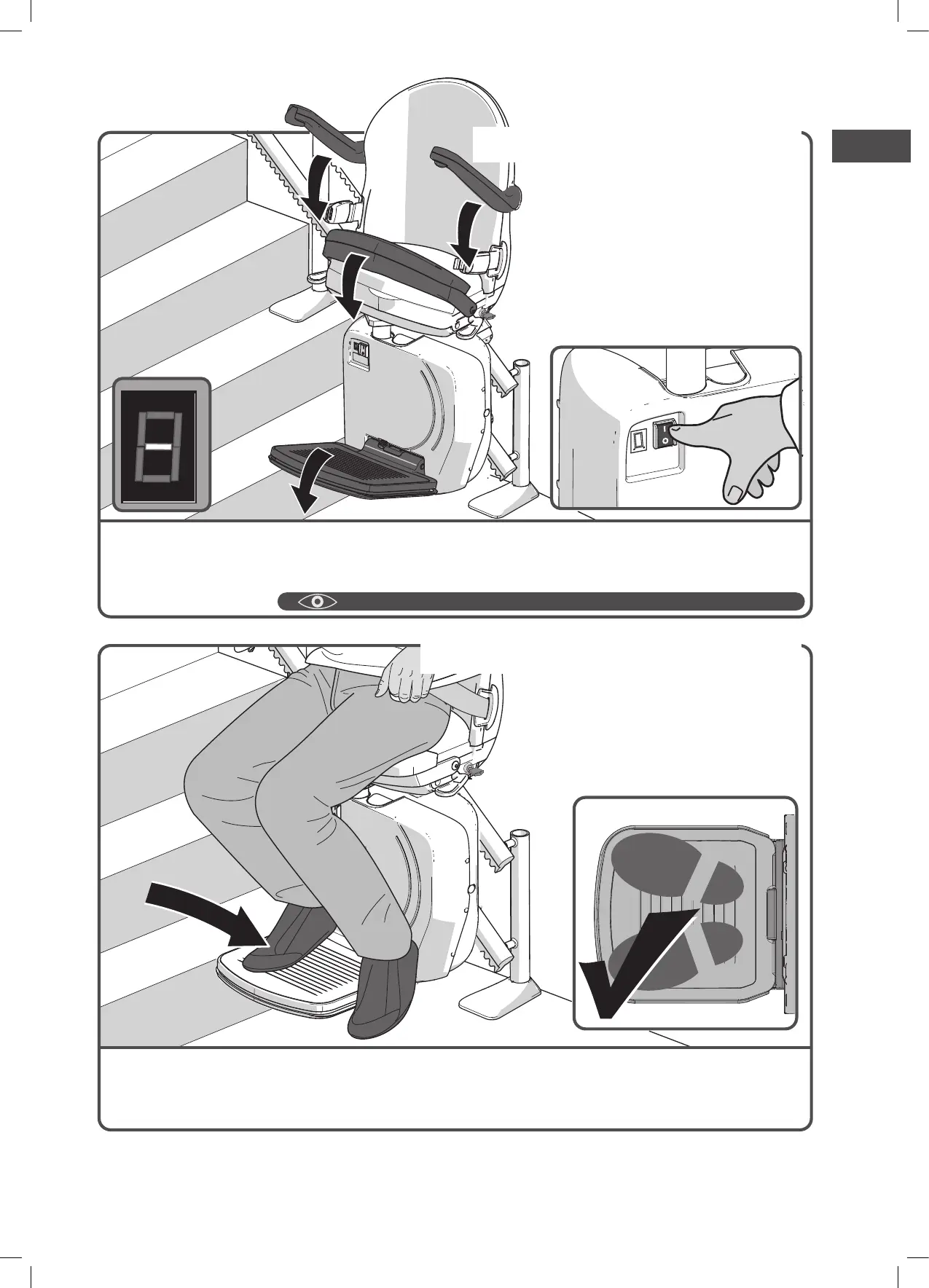 Stellen Sie Ihre Füße auf die Fußstütze. Achten Sie darauf, dass keiner Ihrer Füße über die