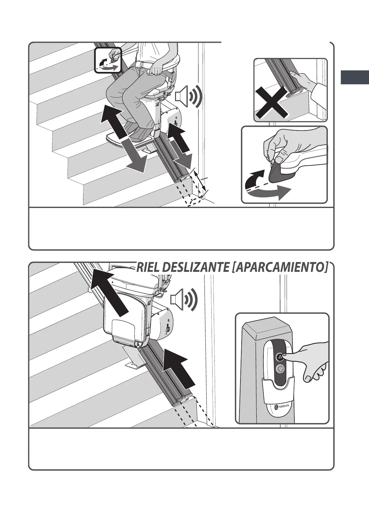 Si el salvaescaleras tiene un riel deslizante, tanto la silla como el riel deslizante se desplazarán