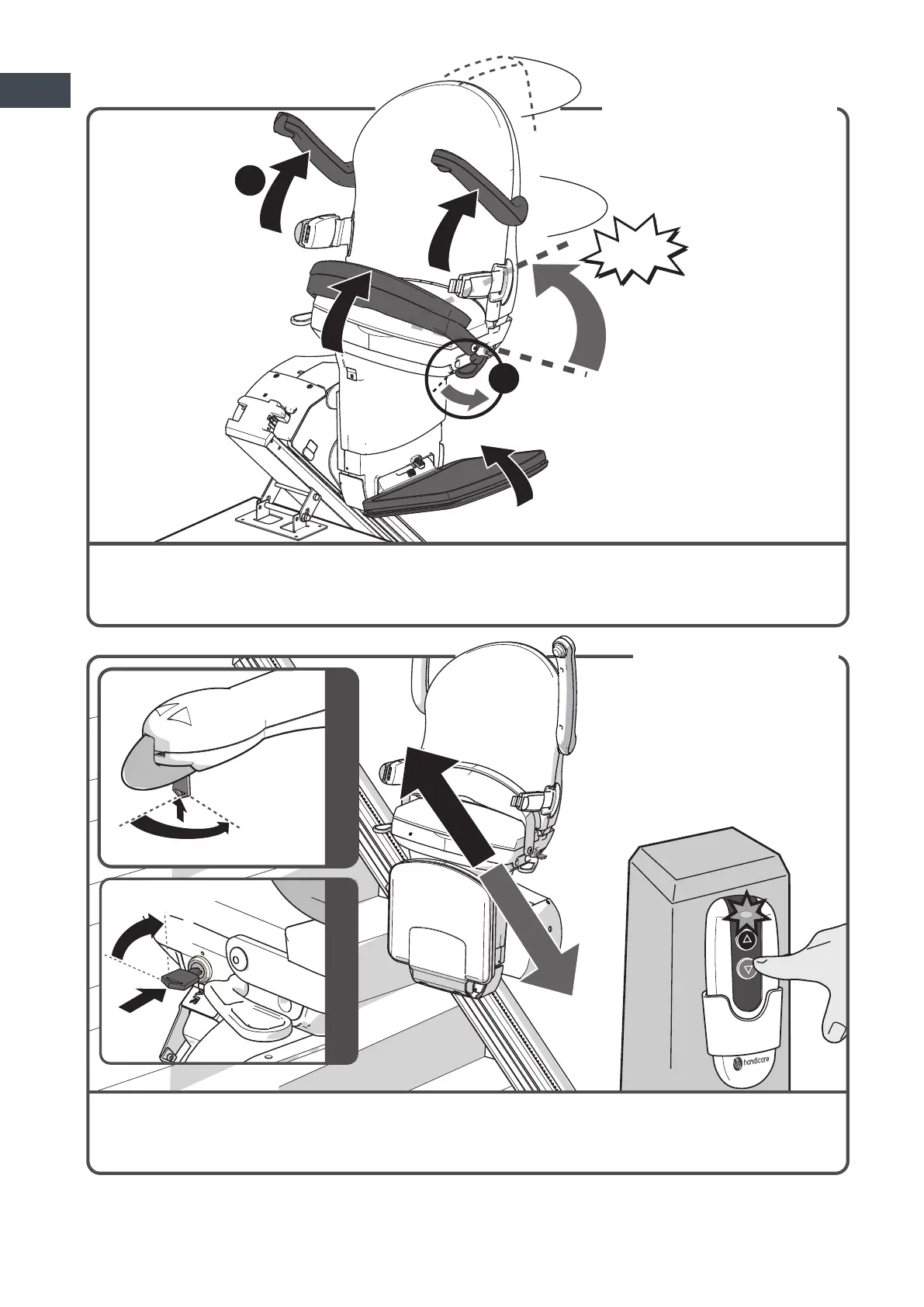 Klap de armleuningen, voetenplank en de stoelzitting op {A}. Druk de hendel