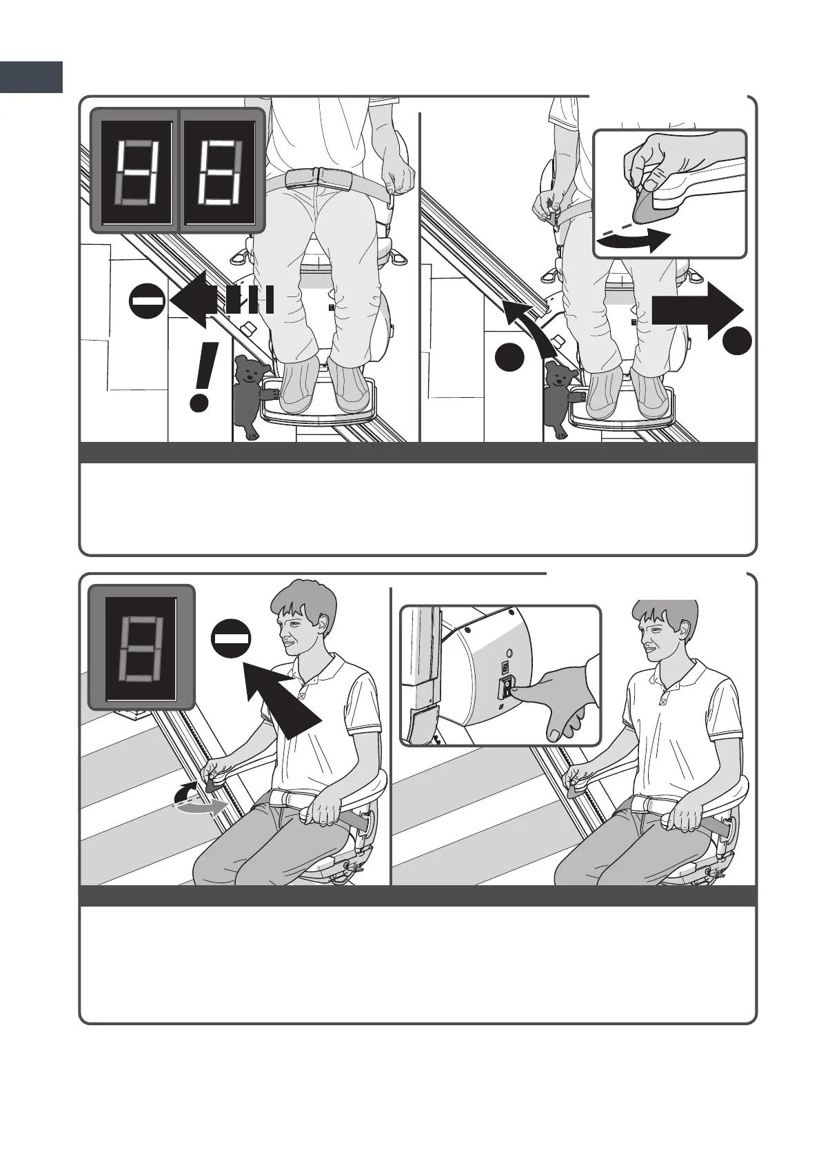 Probleem: De traplift kan in geen van beide richtingen worden bewogen. Er is