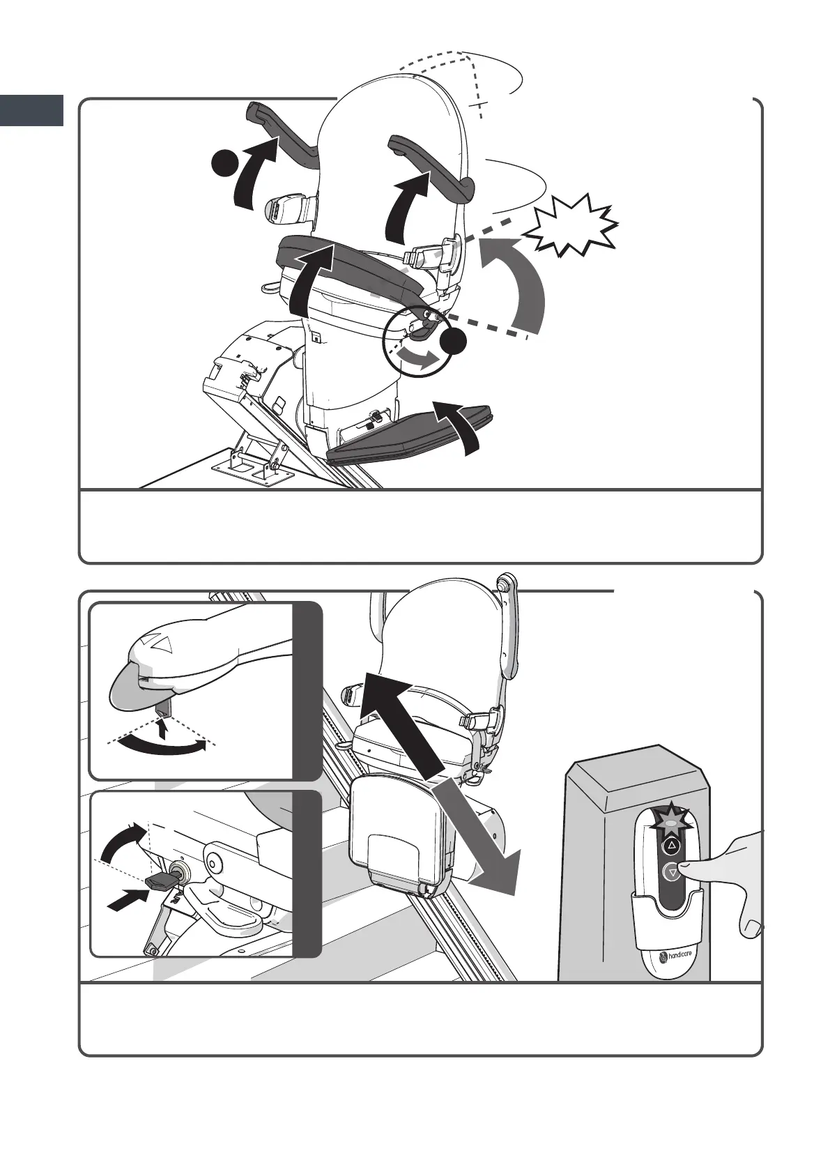 Klappen Sie die Armlehnen, die Fußstütze und die Sitzfläche nach oben{A}. Drücken