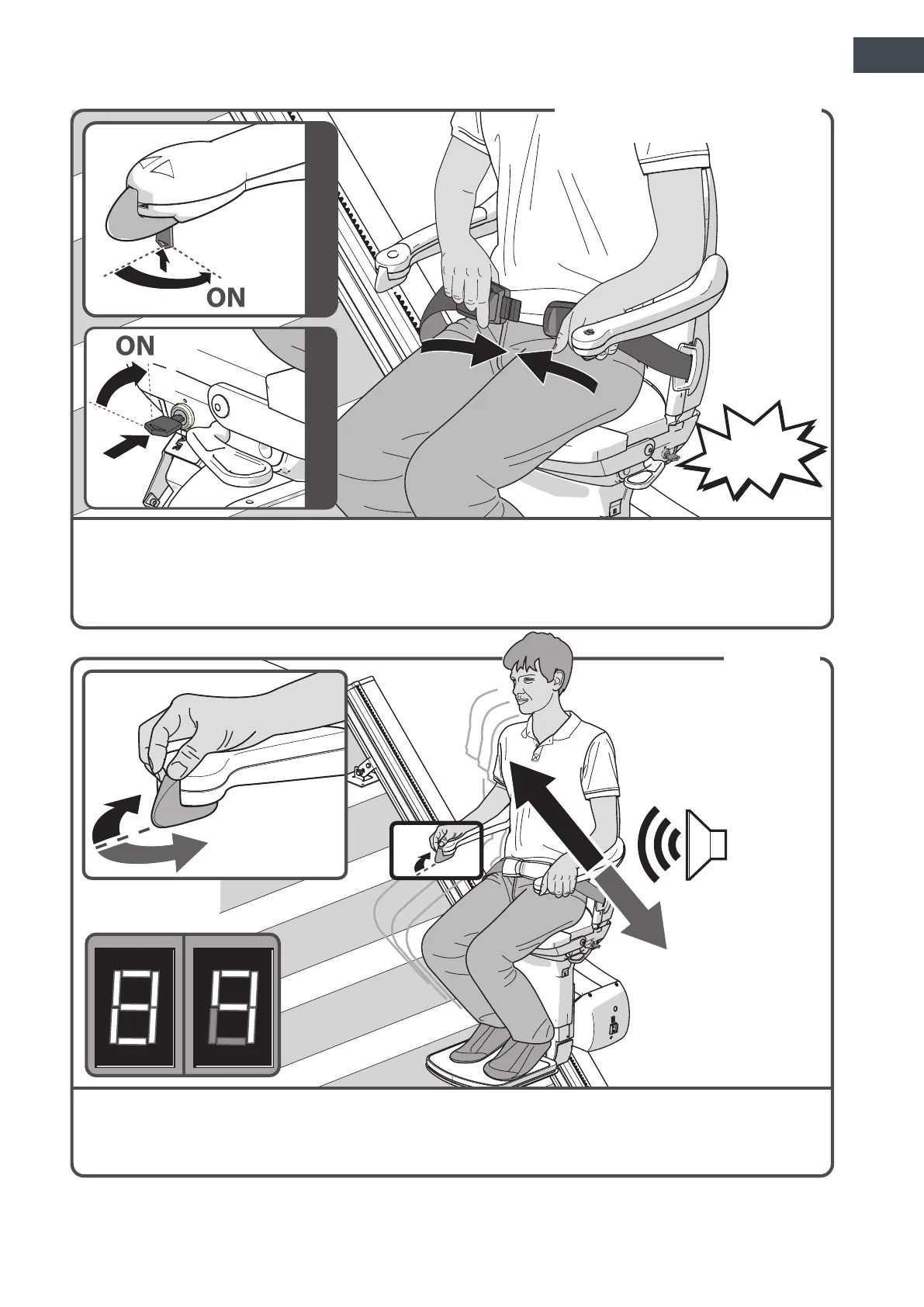 “8/9”, the lift will beep 3 times and start slowly after 1 second. When changing