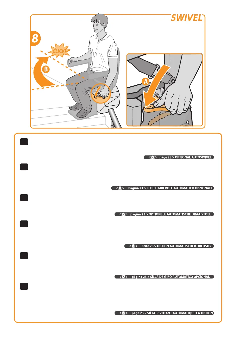 Swivel the seat until you hear a ‘click’. The seat is now in the correct position {B}.