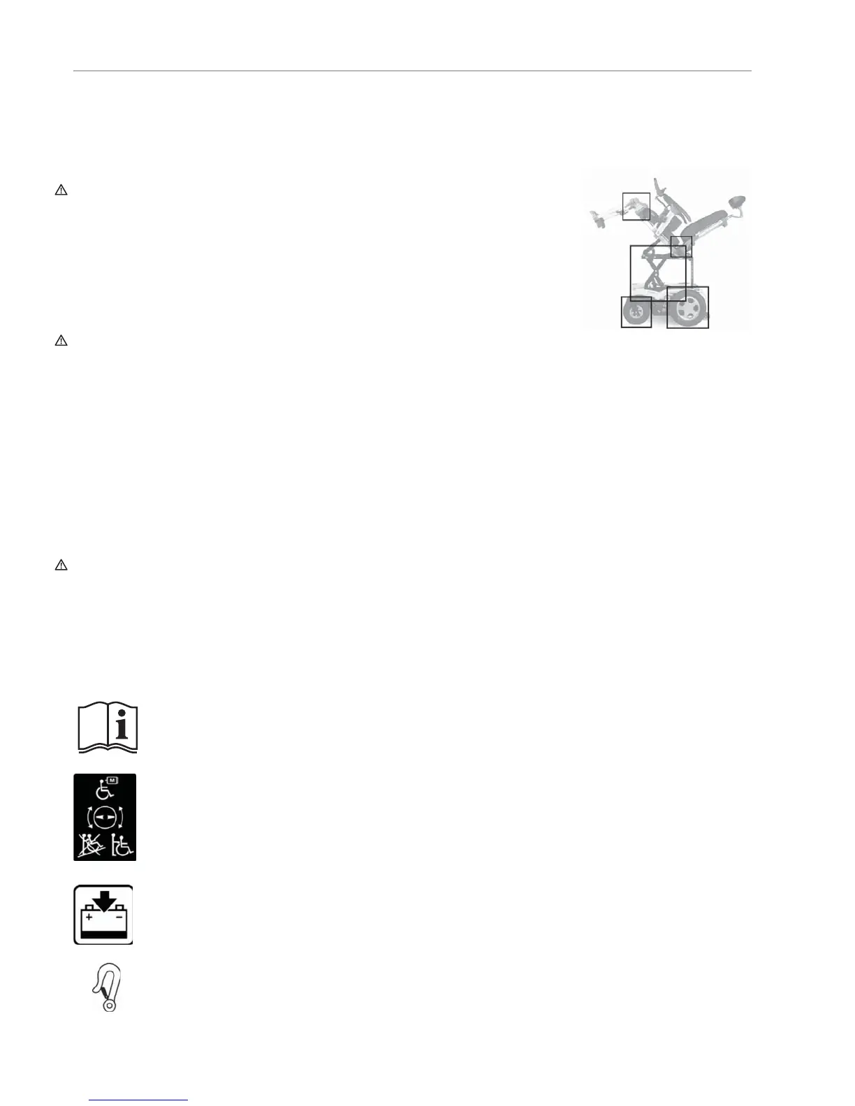 • The signs, symbols and instructions affi xed to the wheelchair comprise part of the safety facilities. They must never be covered