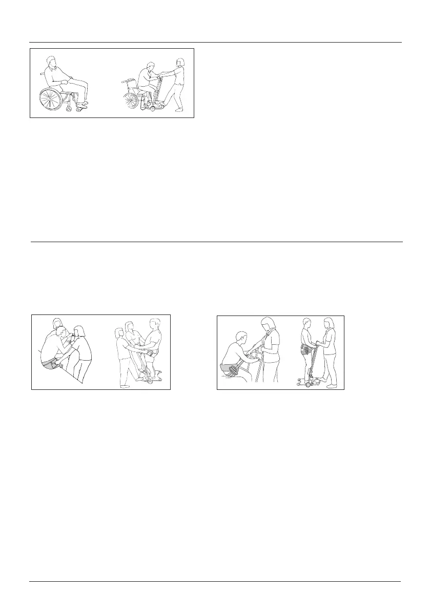 læner sig frem og løfter sig fra sædet. Hjælperen skaber modvægt. Skub brugeren længere tilbage i stolen, når han/hun har