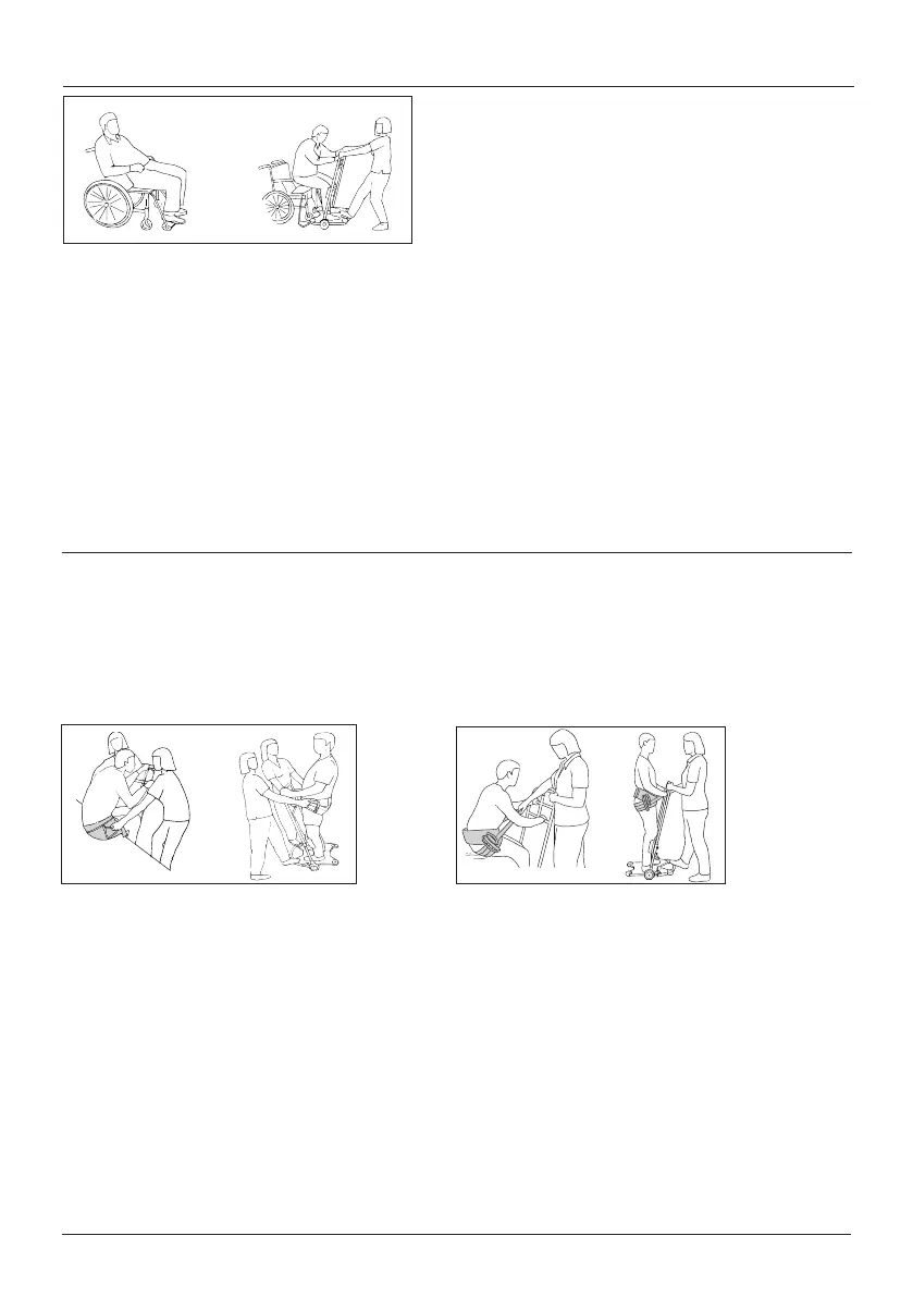 Fußplatte, fasst den Griff, lehnt sich nach vorne und erhebt sich vom Sitz. Die Hilfsperson bietet Gegengewicht. Schieben Sie