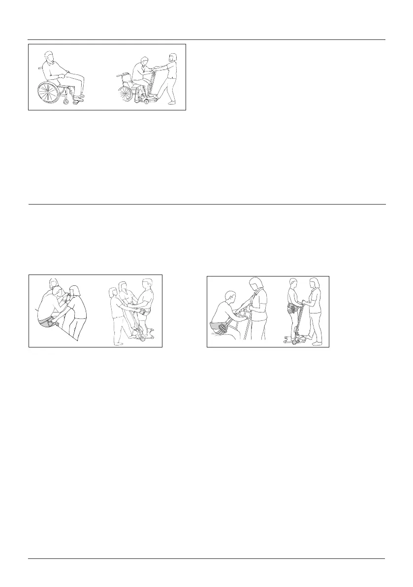 placerar fötterna på fotplattan, greppar, lutar sig fram och lättar från sitsen. Medhjälparen ger motvikt. Skjut brukaren längre