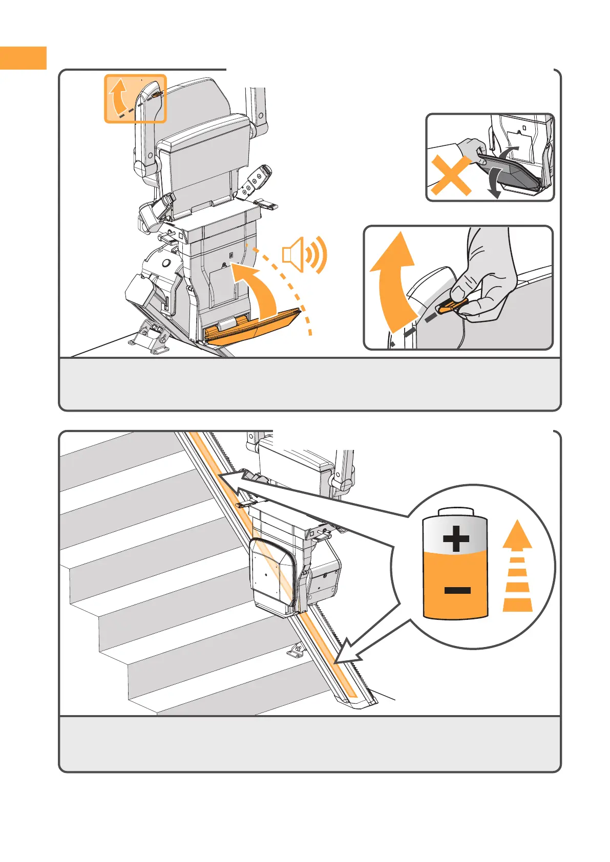 Zorg ervoor dat tijdens het rijden van de lift de voetenplank altijd uitgeklapt is.