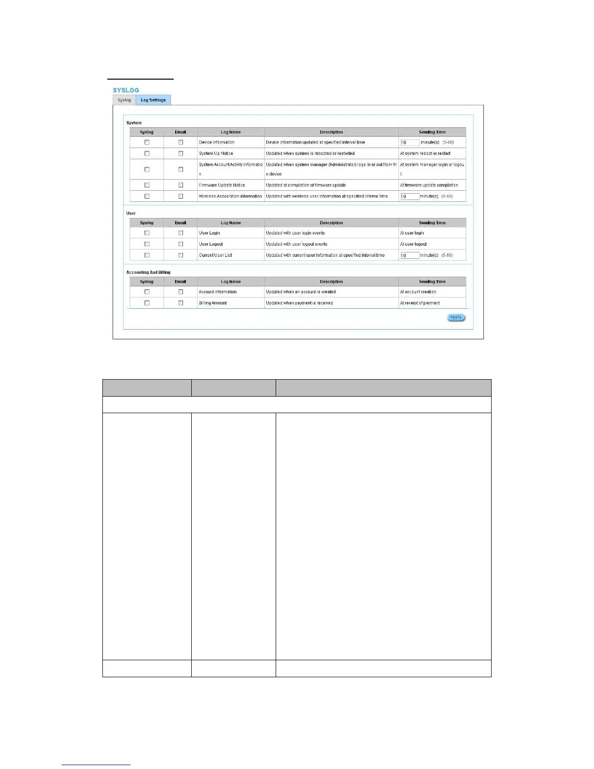 Device Information Every 10 minute(s) The range is 5~60 minutes. The log included system information