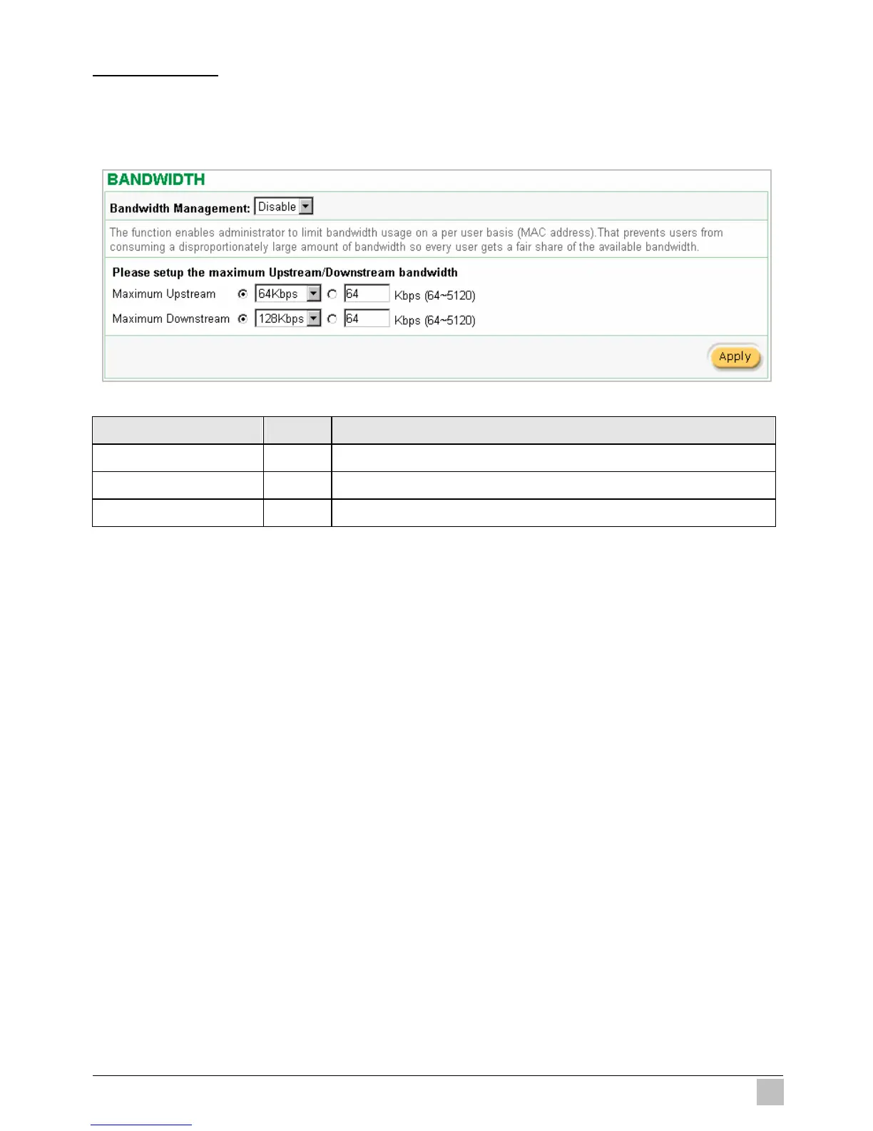 The function enables administrator to limit bandwidth usage on a per user basis (MAC address). That