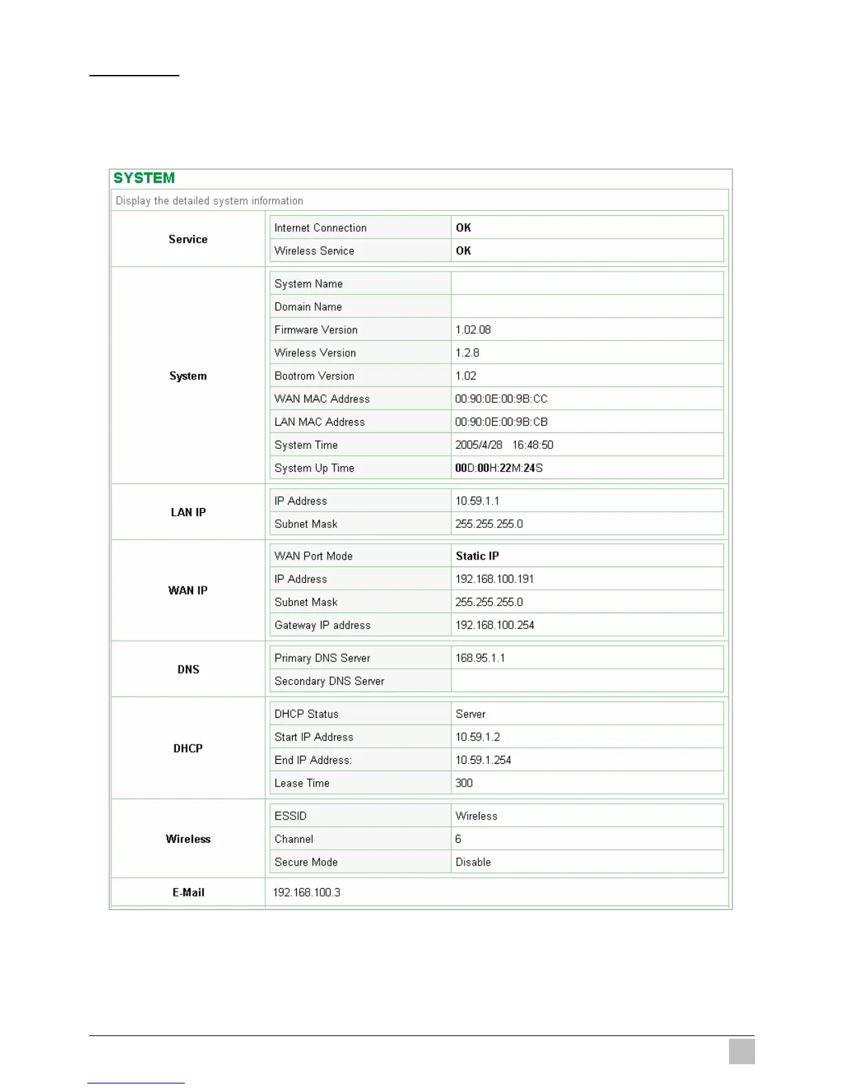 connection message, host name, LAN, WAN, DHCP Configuration, DNS, E-mail Redirection, SSL