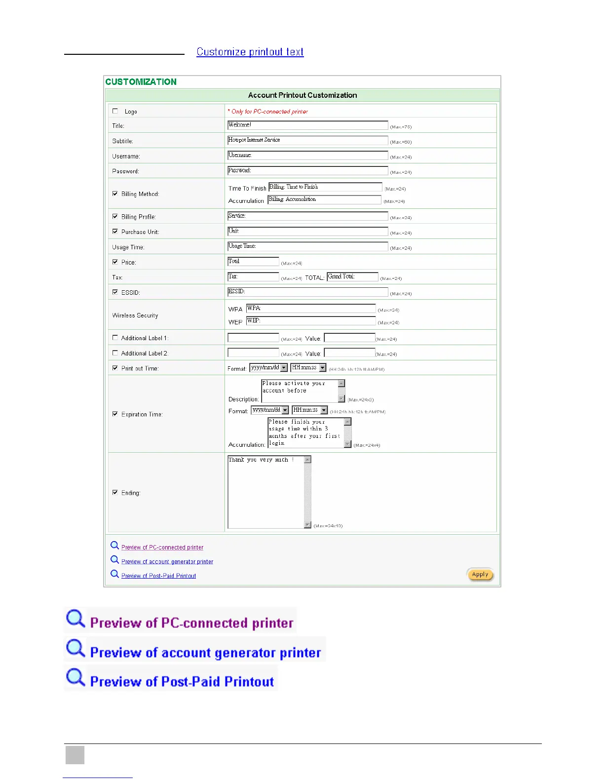 Figure 3-22 Customize Printout Text Setting Screen
