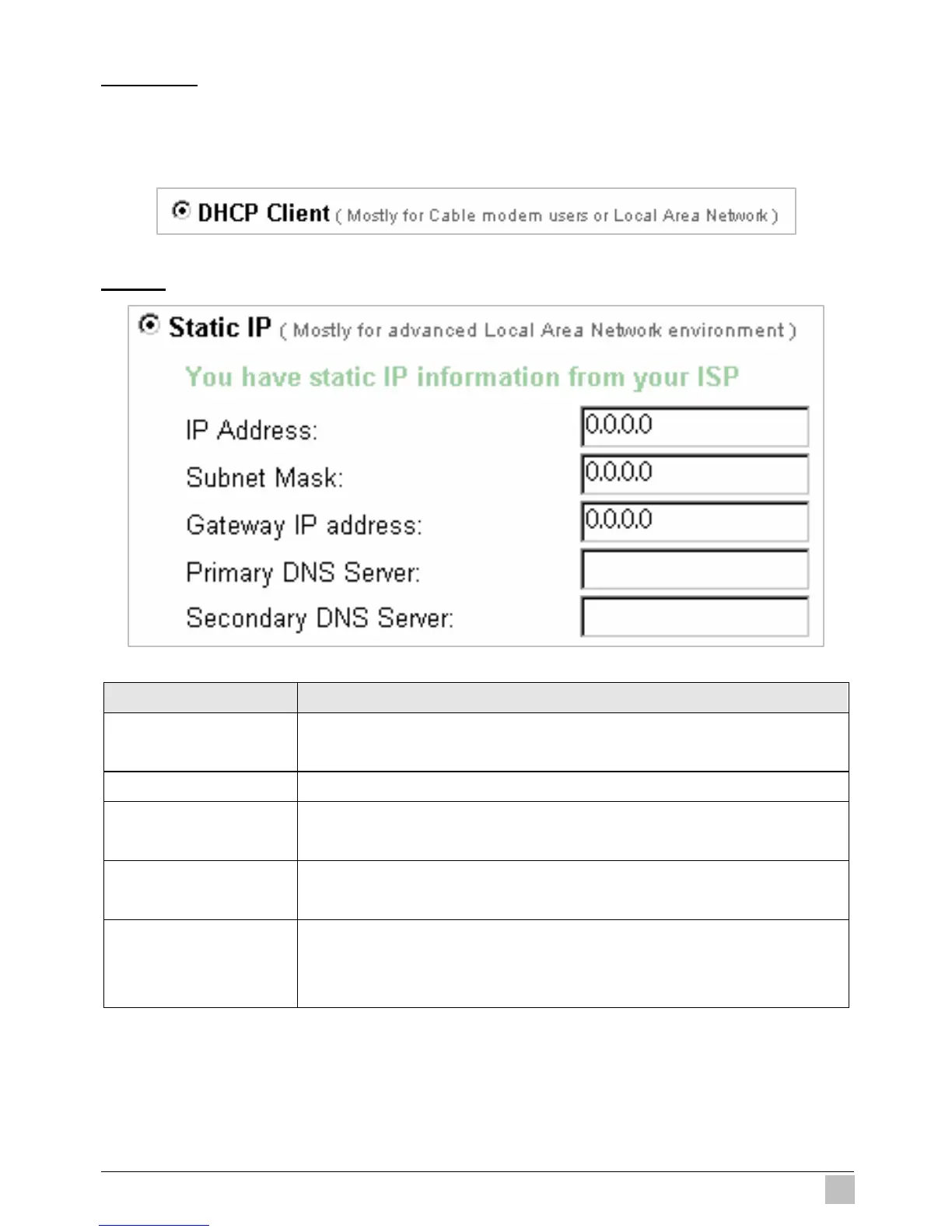 Gateway IP Gateway Enter the Gateway IP address for the xDSL/Cable connection (provided by