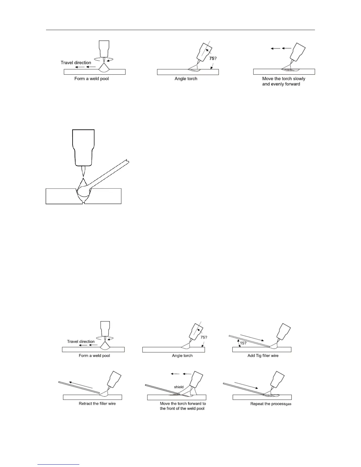 edge of the weld pool. The filler wire is usually held at about a 15° angle and fed into the