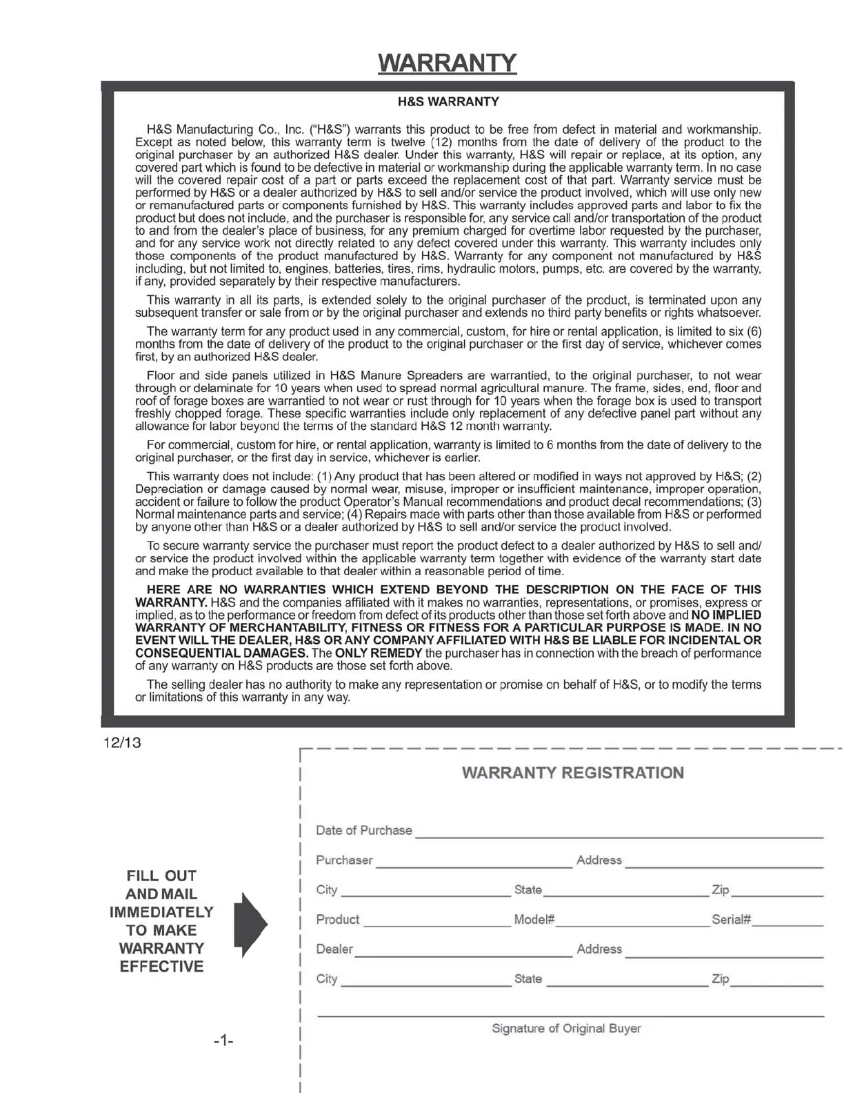 H&S LW1100 - Warranty Information