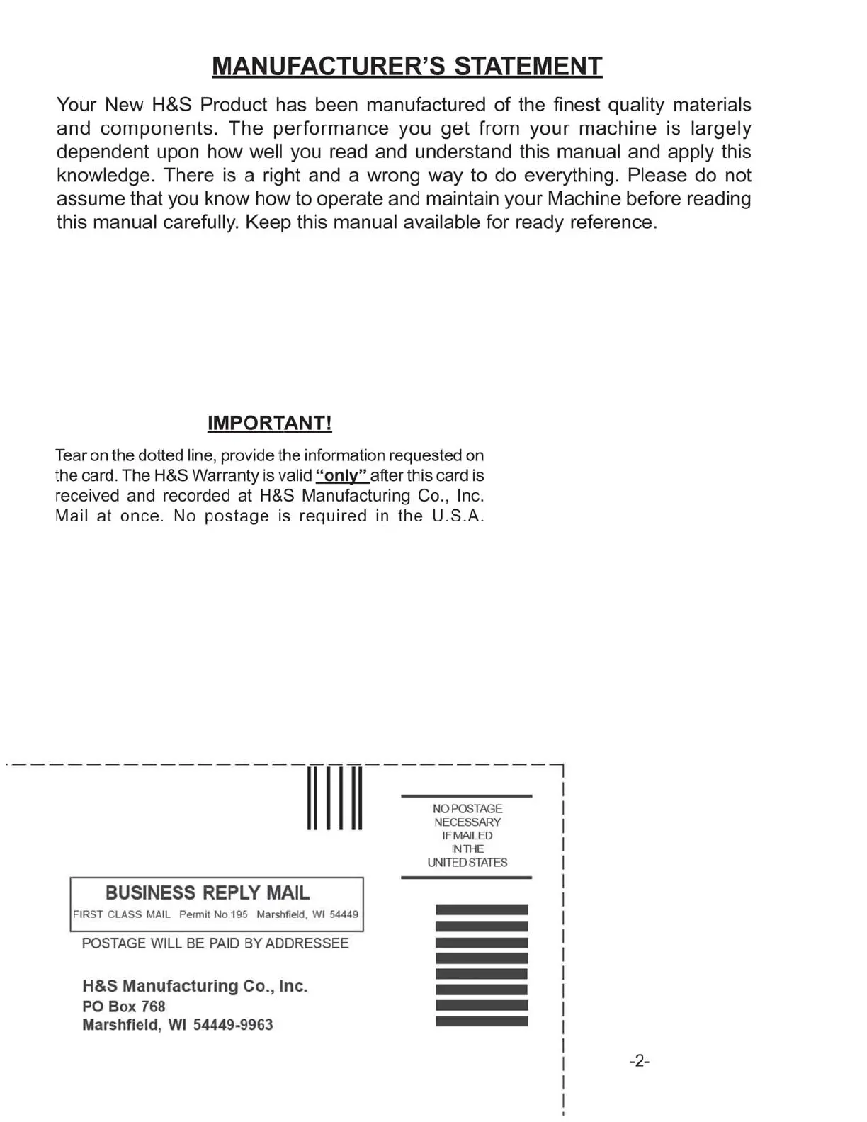H&S LW1100 - Manufacturers Statement