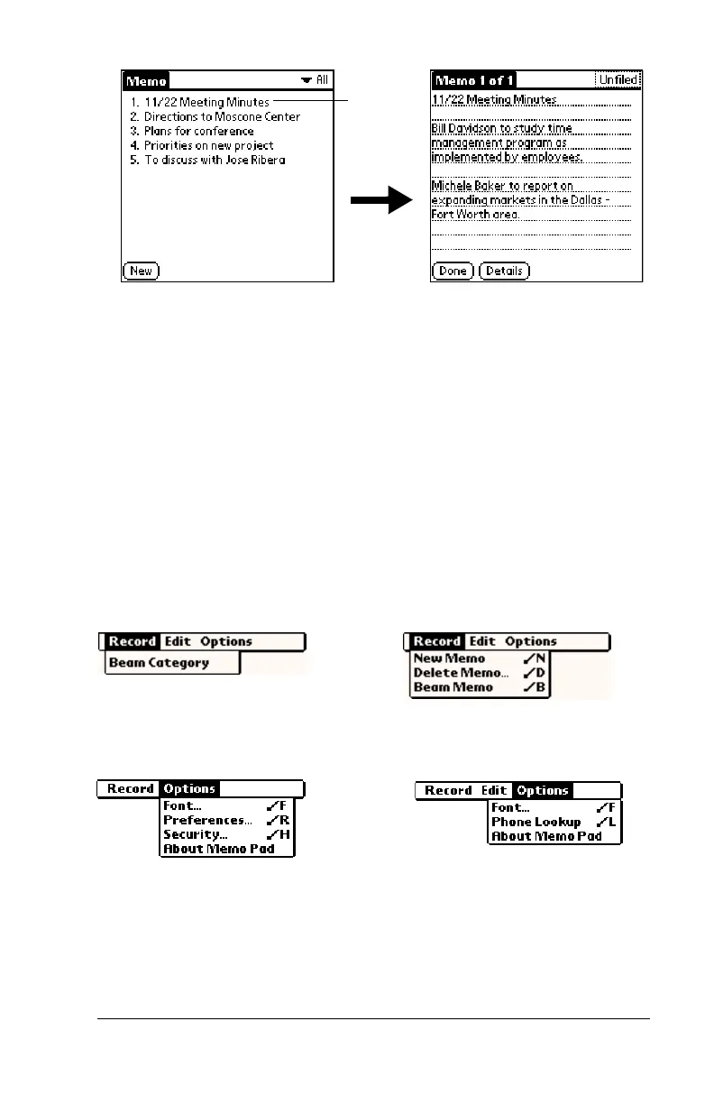 Memo Pad menus are shown here for your reference, and Memo Pad