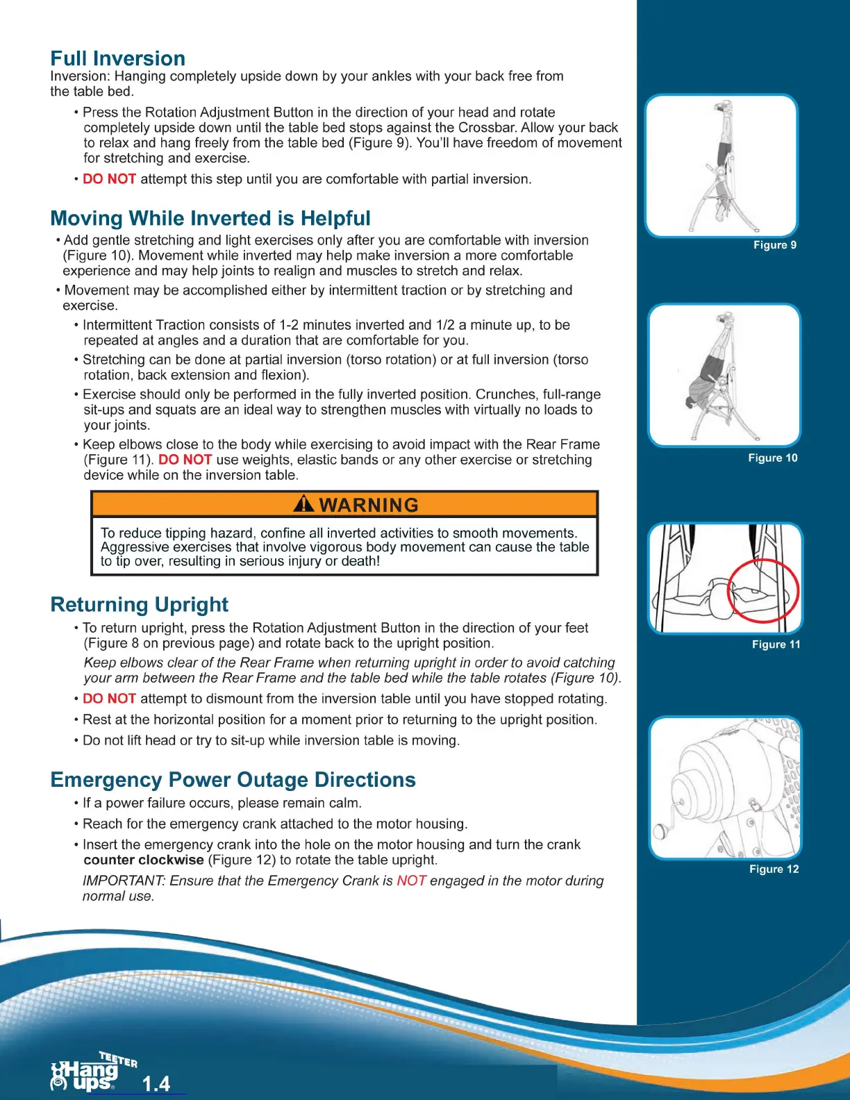 Hang ups Teeter Inversion Table - Full Inversion; Moving While Inverted is Helpful; Returning Upright; Emergency Power Outage Directions
