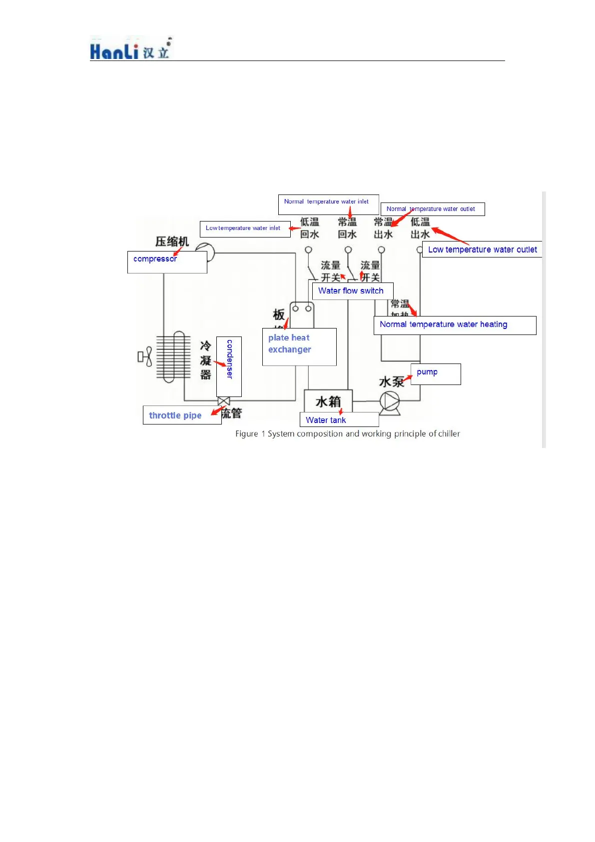 The chiller is composed of a compressor, a condenser, a throttling device, an evaporator, a