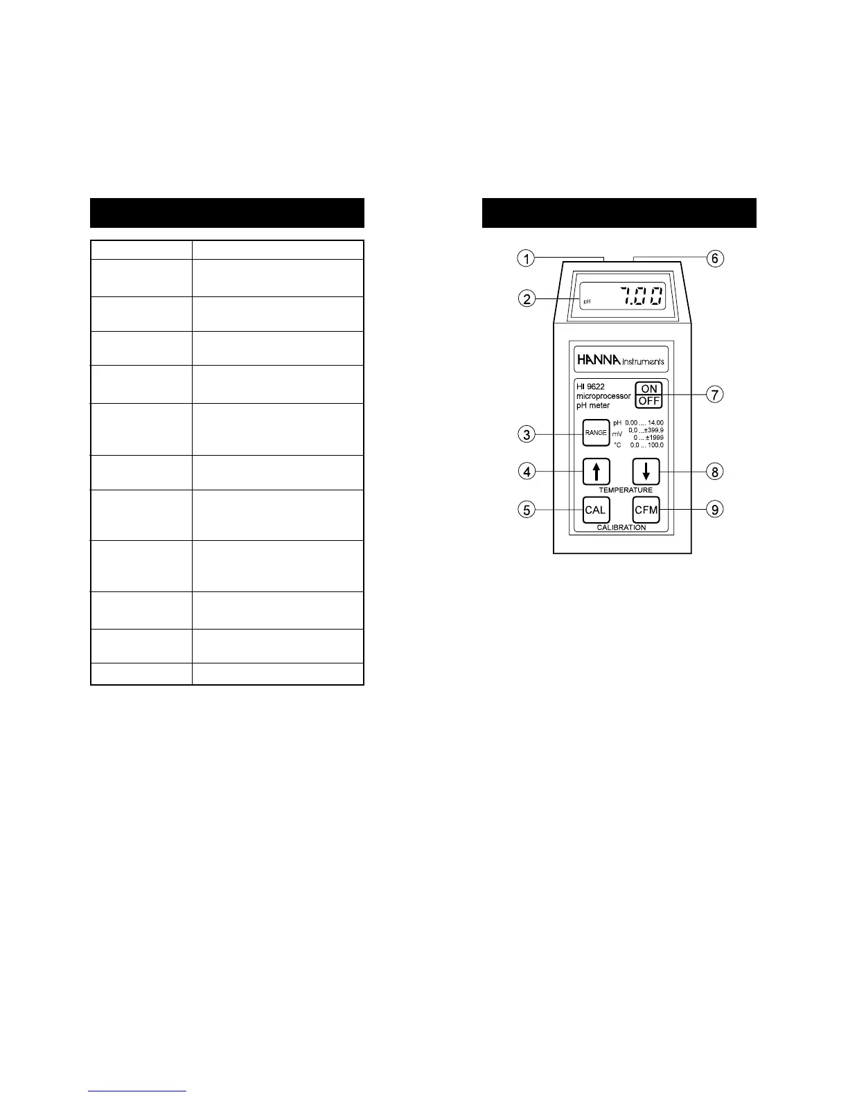 3) RANGE to select the pH, °C or mV range.