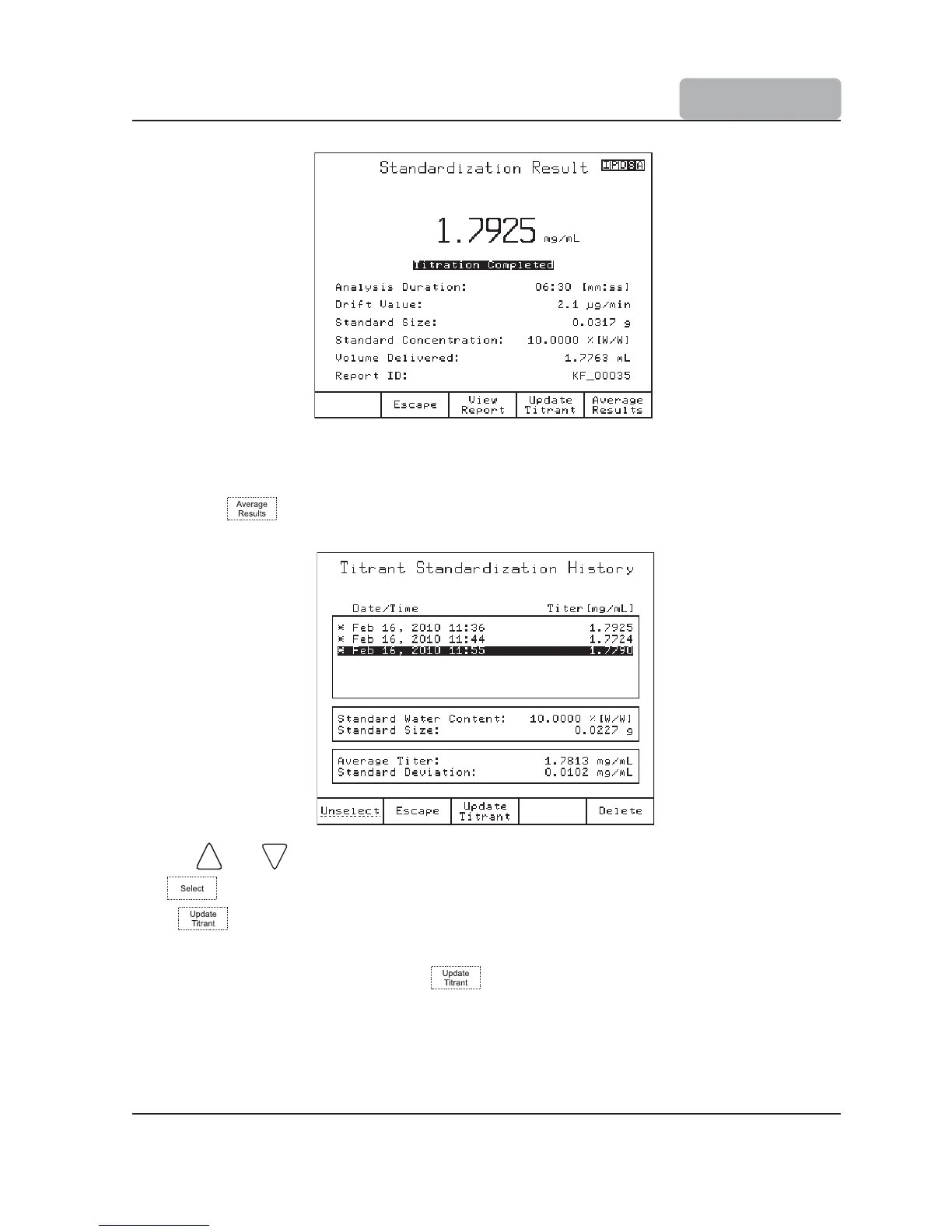 Note: When there are no results selected dashes will appear in the average titrant concentra-