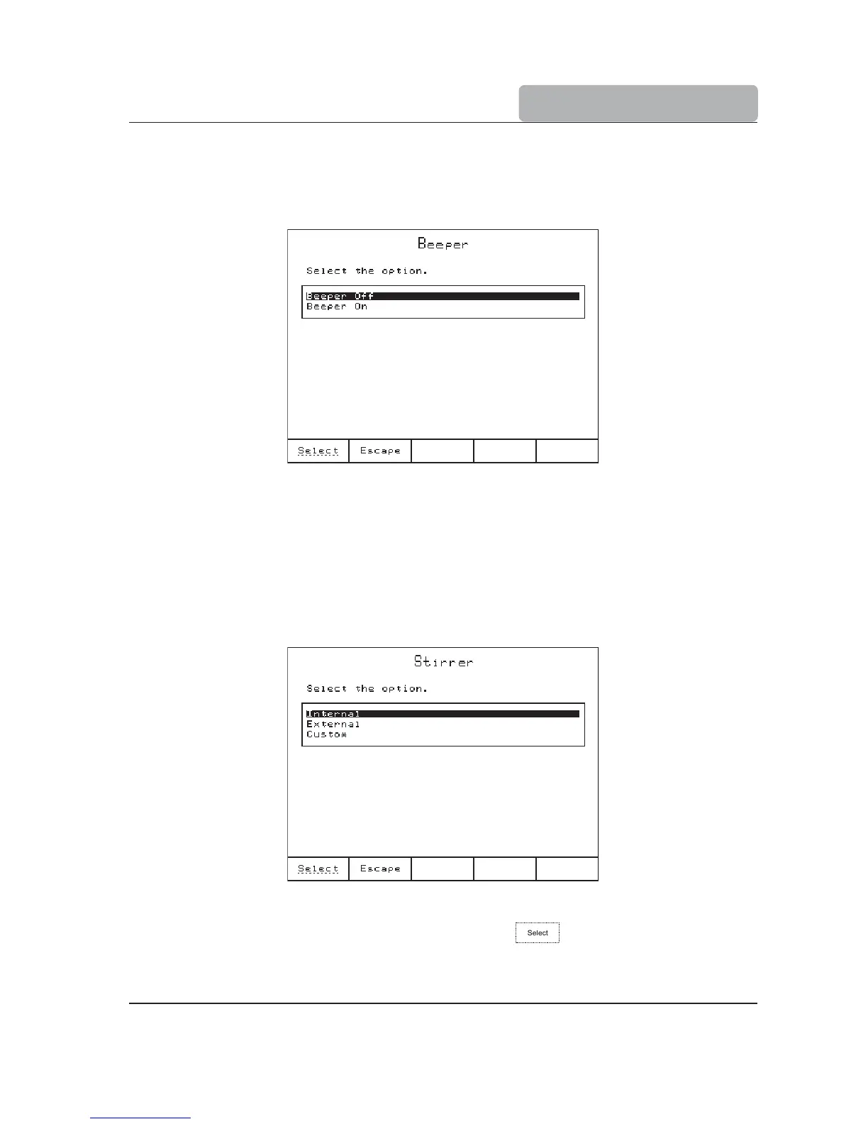 This screen allows the user to select the internal magnetic stirrer, an external magnetic stirrer
