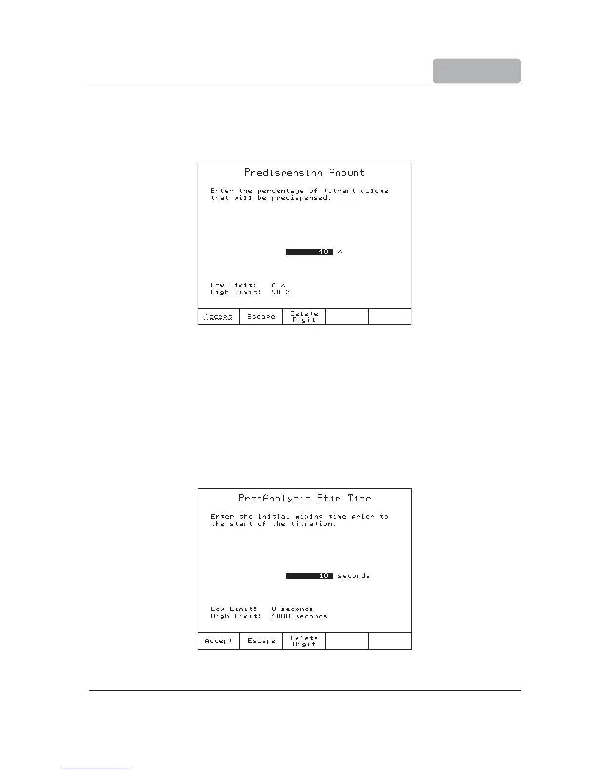 The predispensing amount can be set to deliver between 1 and 90% of the titrant required