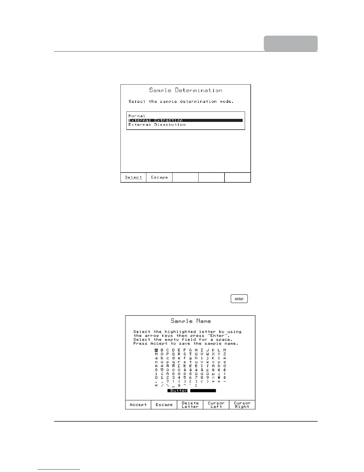 This screen allows the user to enter a name for the sample (up to 14 characters). Use the