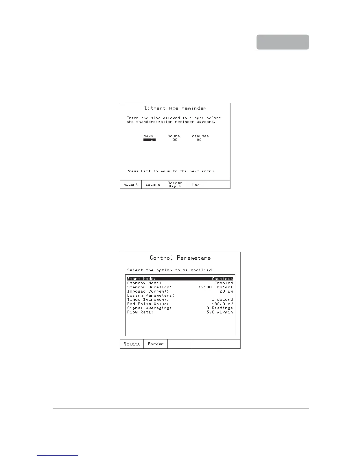 screen. The reminder period will reset once the titrant is restandardized or the set time is