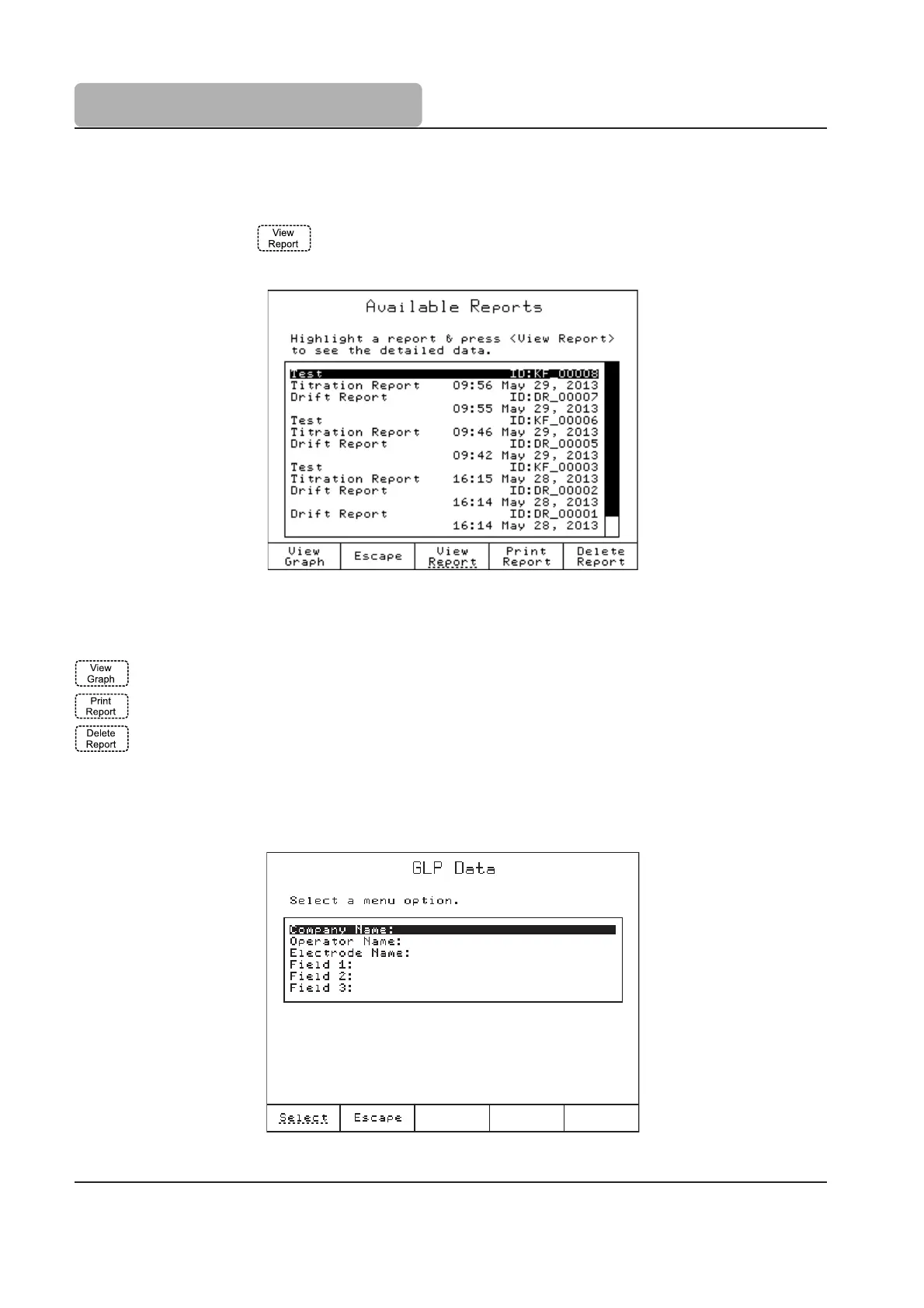 Up to 100 reports can be saved on the titrator. To view one of the saved reports highlight a