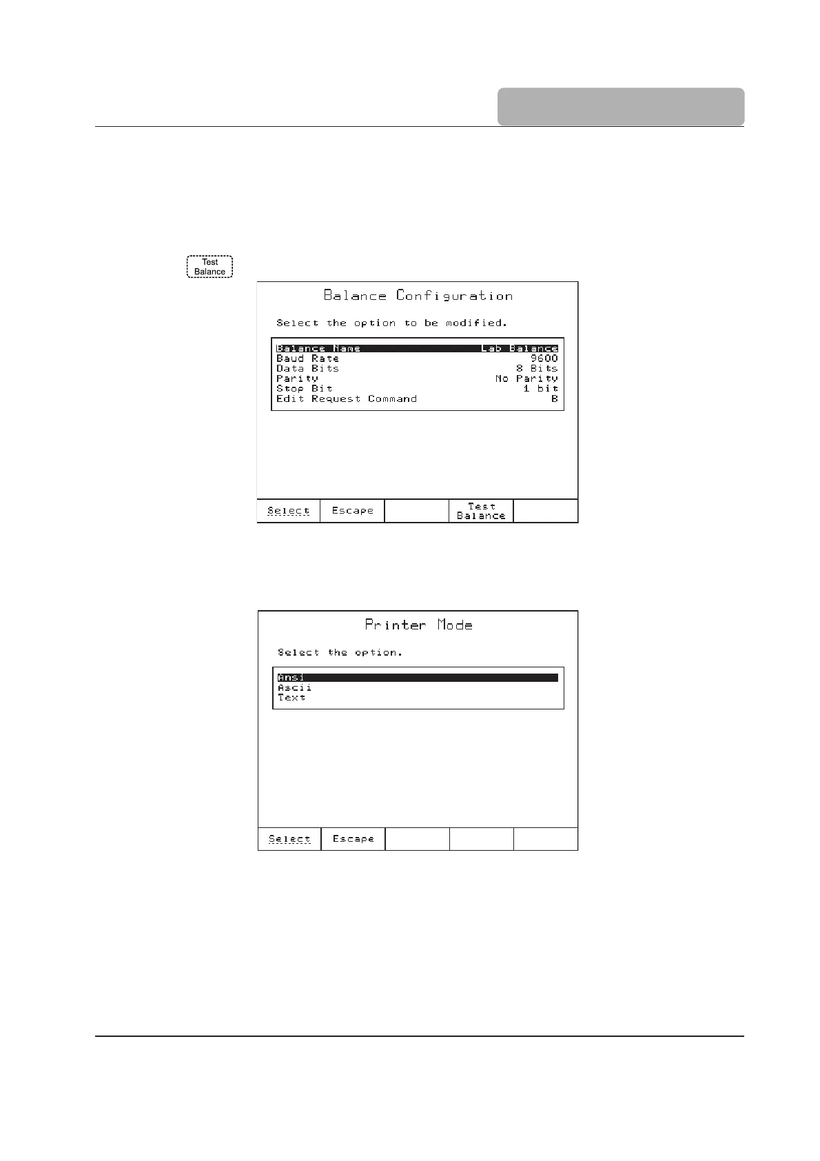 This screen allows the user to select the printing mode: ANSI (default), ASCII and Text