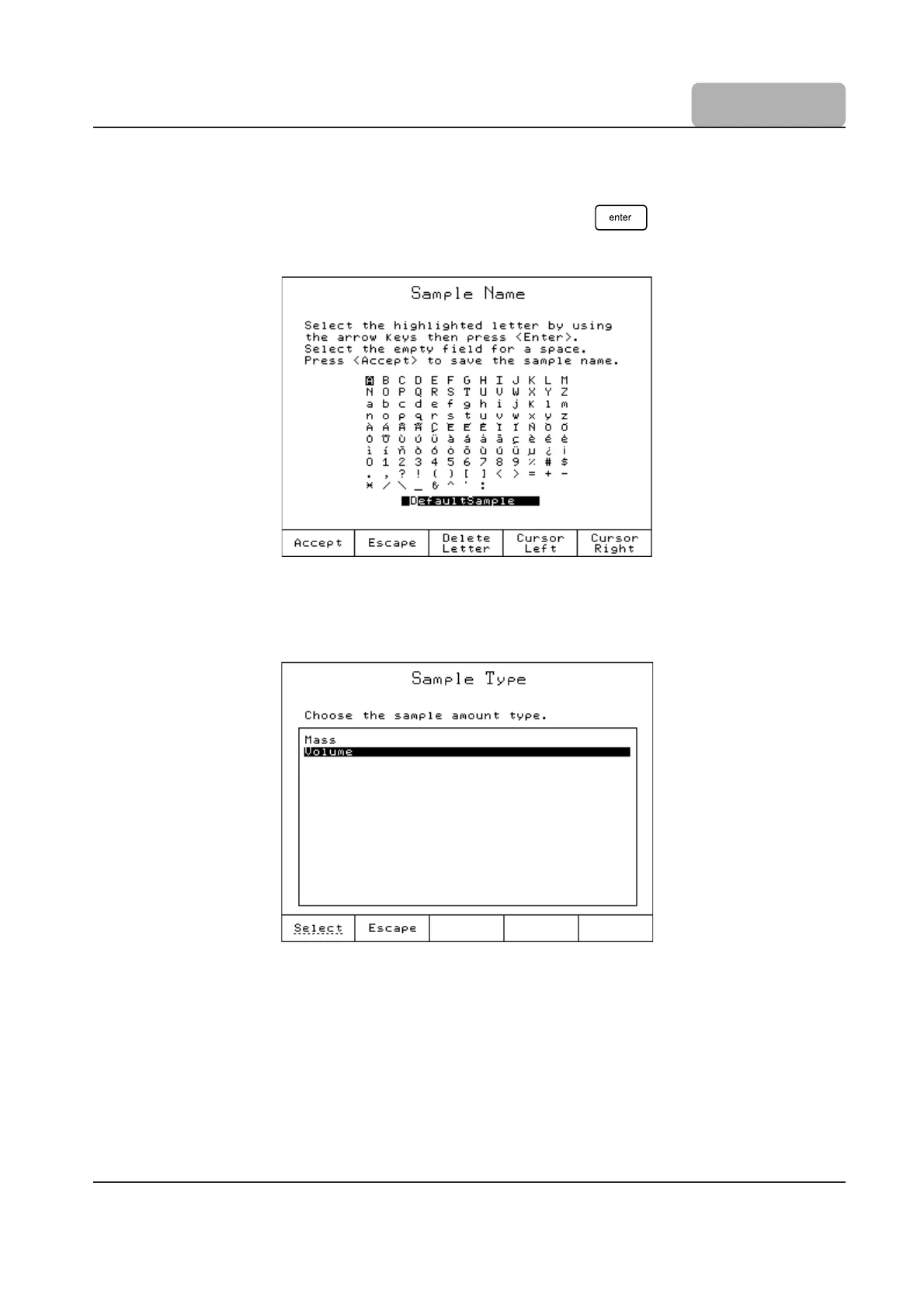This screen allows the user to enter a name for the sample (up to 14 characters). Use the