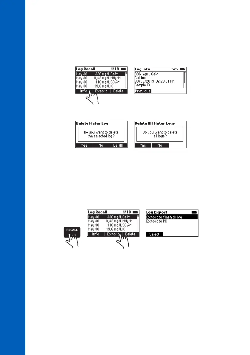 Log data can be exported to a USB flash drive or to a PC. To access data export functions, press the