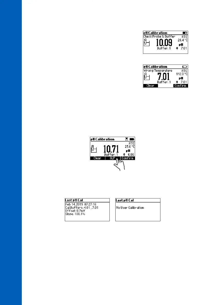 The pH GLP screen displays the date and time, buffers, slope and offset for the last calibration. If the