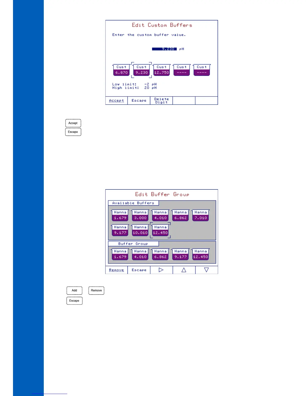 • Use the arrow keys to select the pH buffer to be included/removed in/from the buffer group.