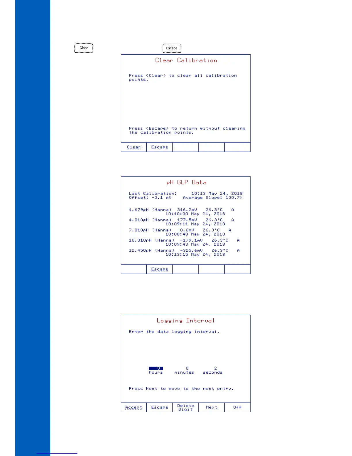 This option clears the existing pH calibration for the selected channel. If the calibration is cleared, the factory calibration will be used.