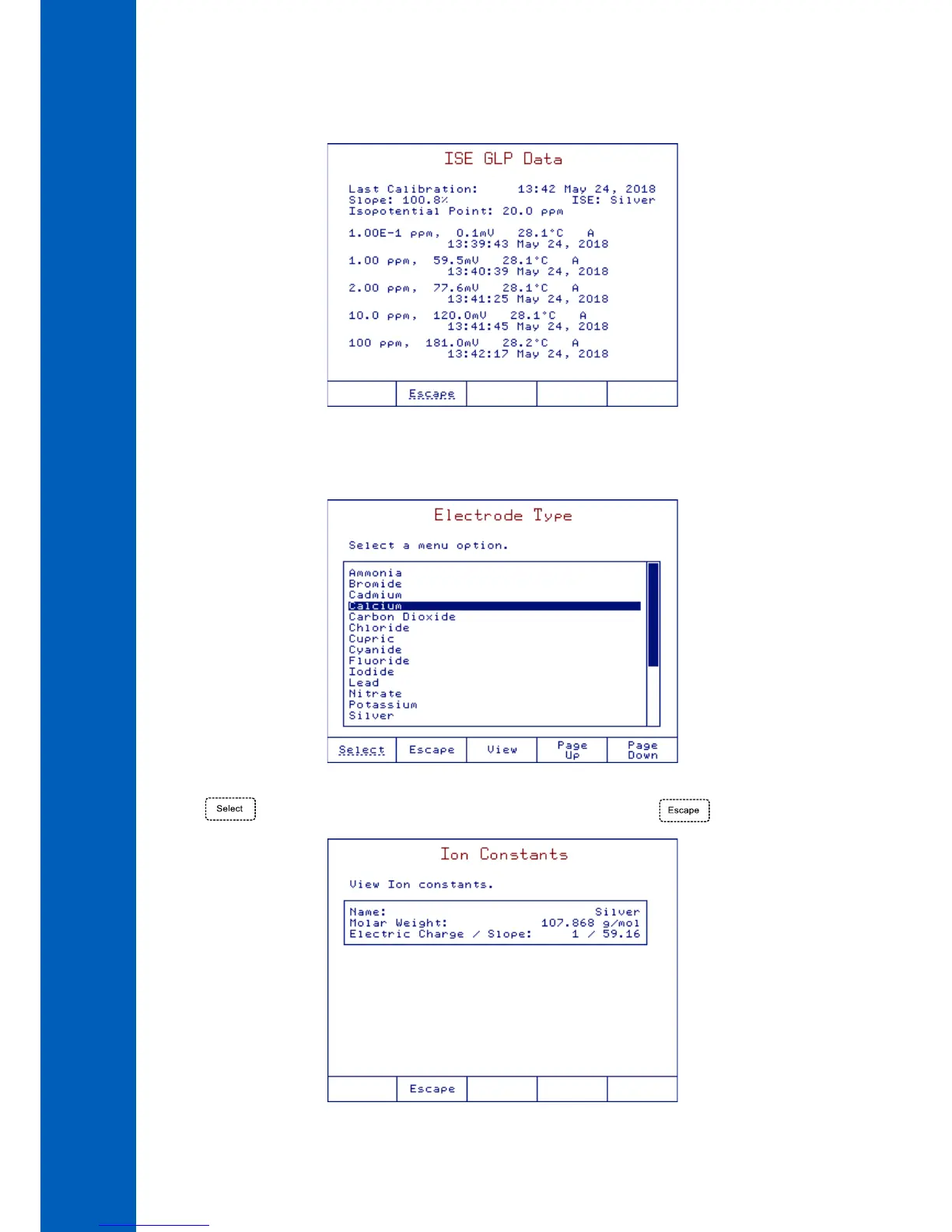 • Press to see the ion constants (name, molar weight, electric charge/slope), press to return to the setup