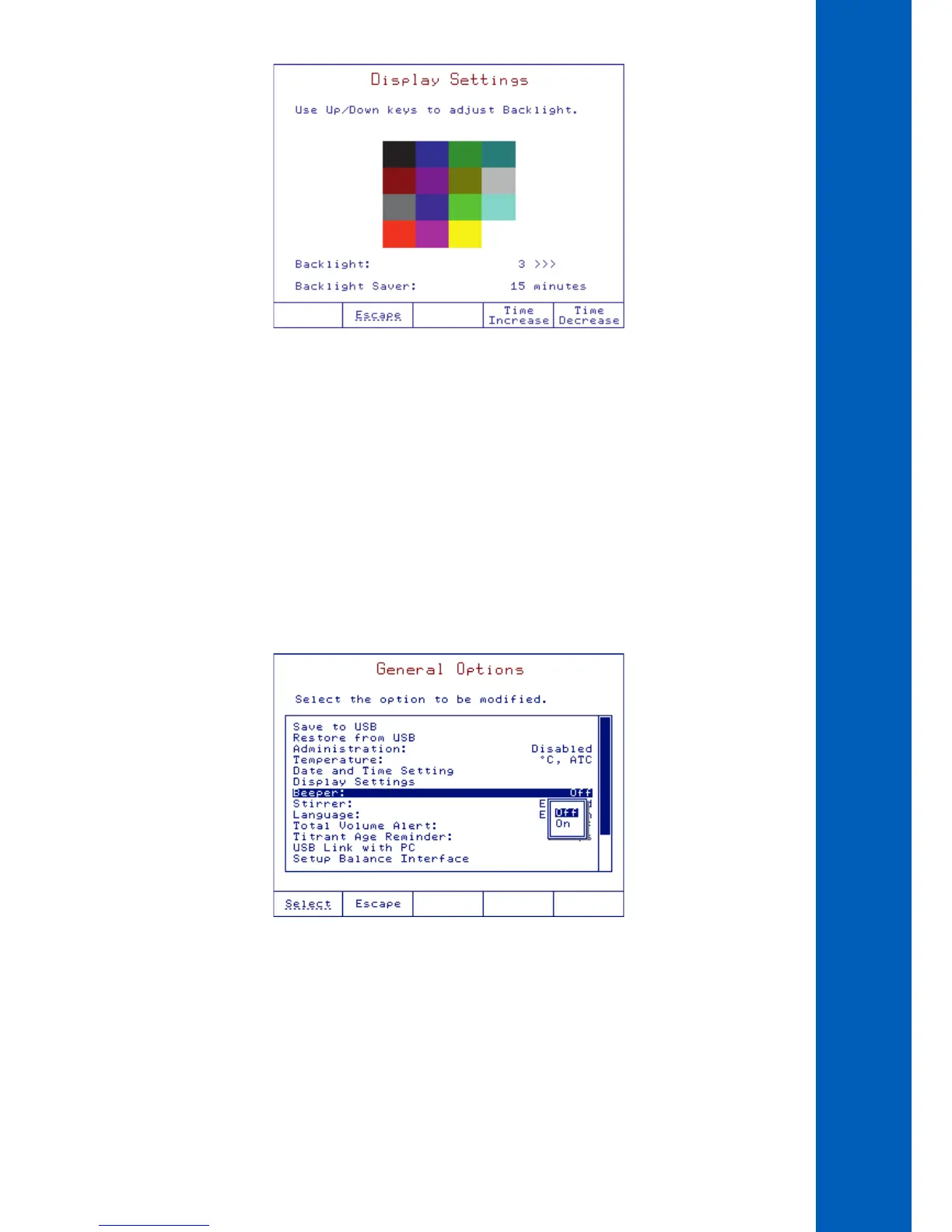If enabled (on) an audible alert will sound after a titration is completed, when an invalid key is pressed or when a critical error occurs