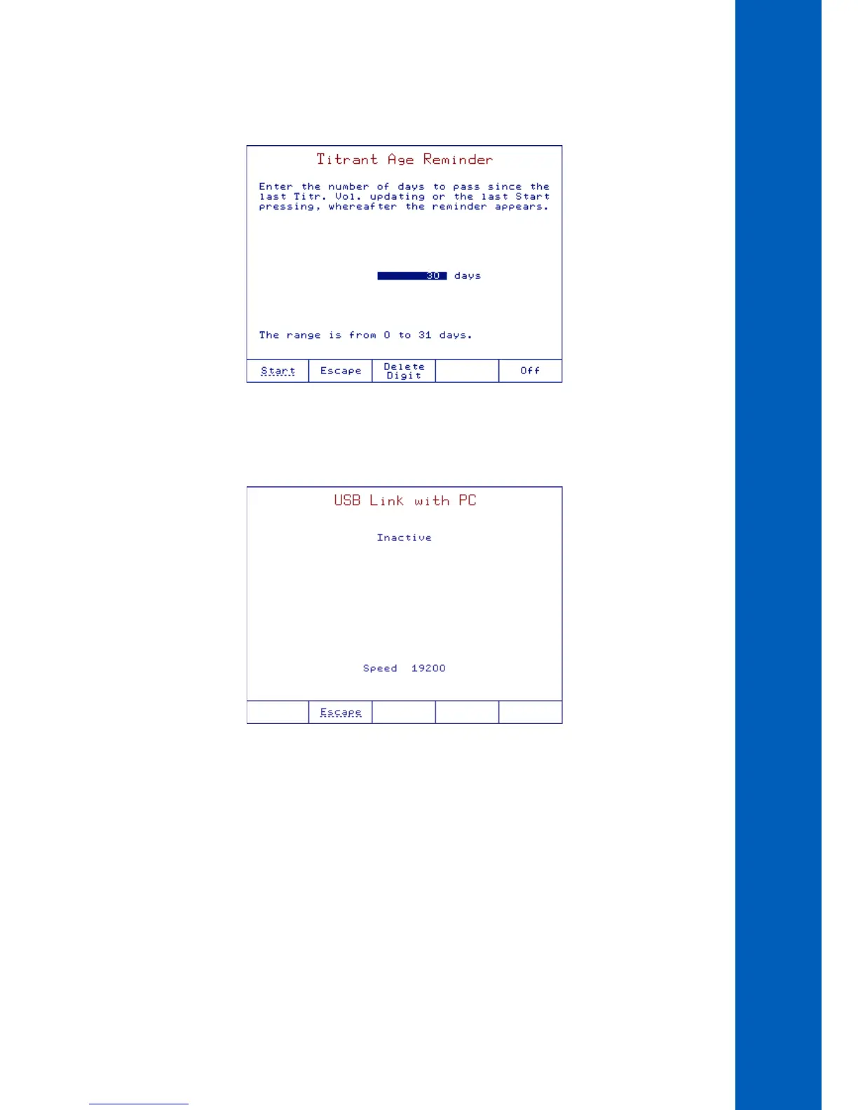A programmable reminder will appear when it is time to verify the titrant concentration or to change the titrant.
