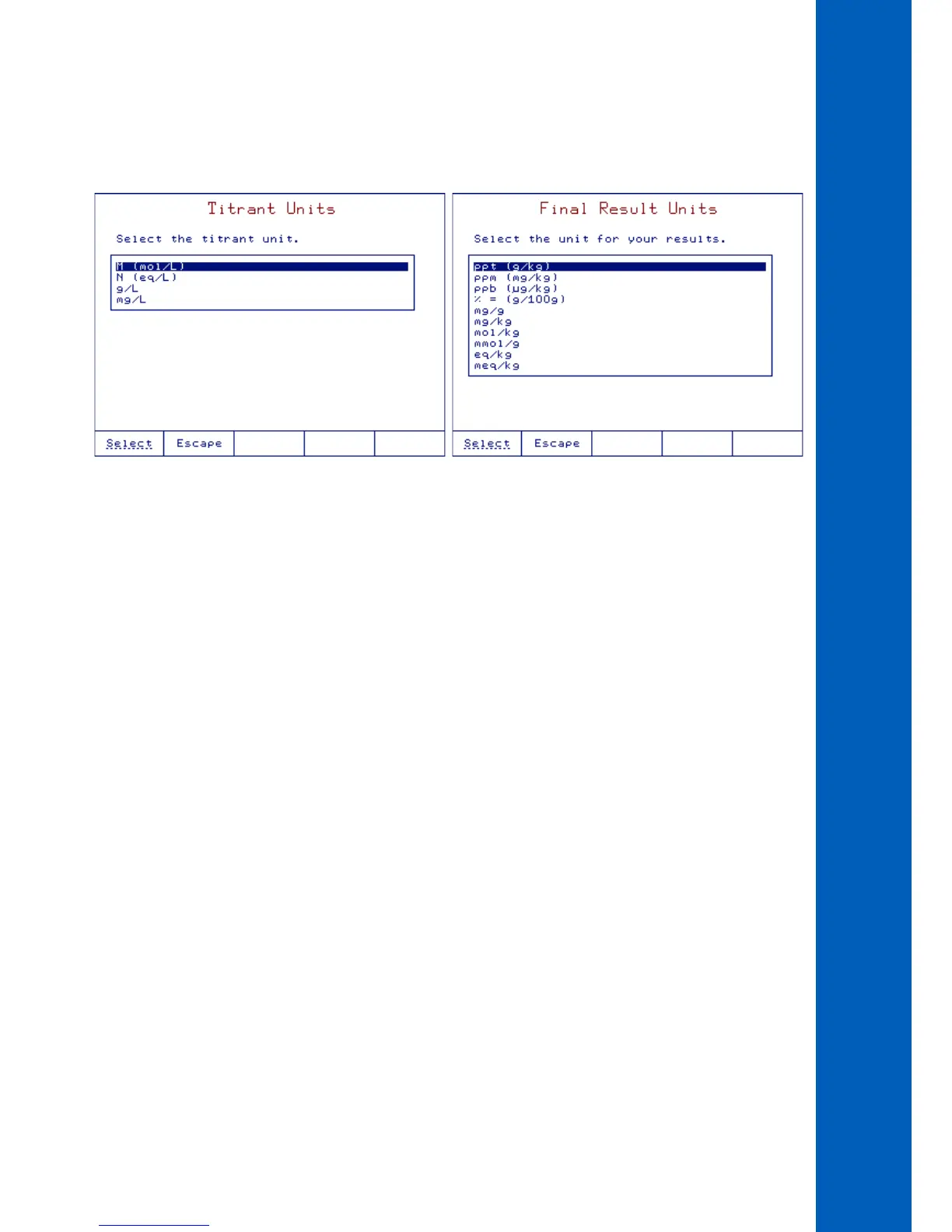 The titrator will calculate the results based on the selected units.
