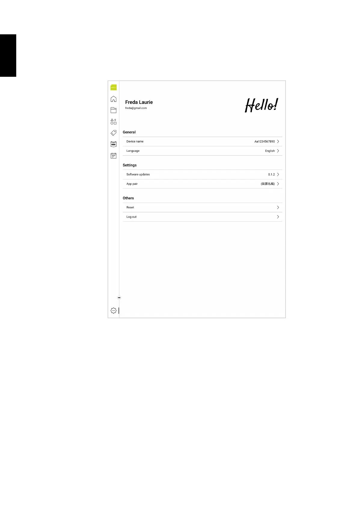 Tap the Settings icon in the navigation menu to manage your device name, change the language,