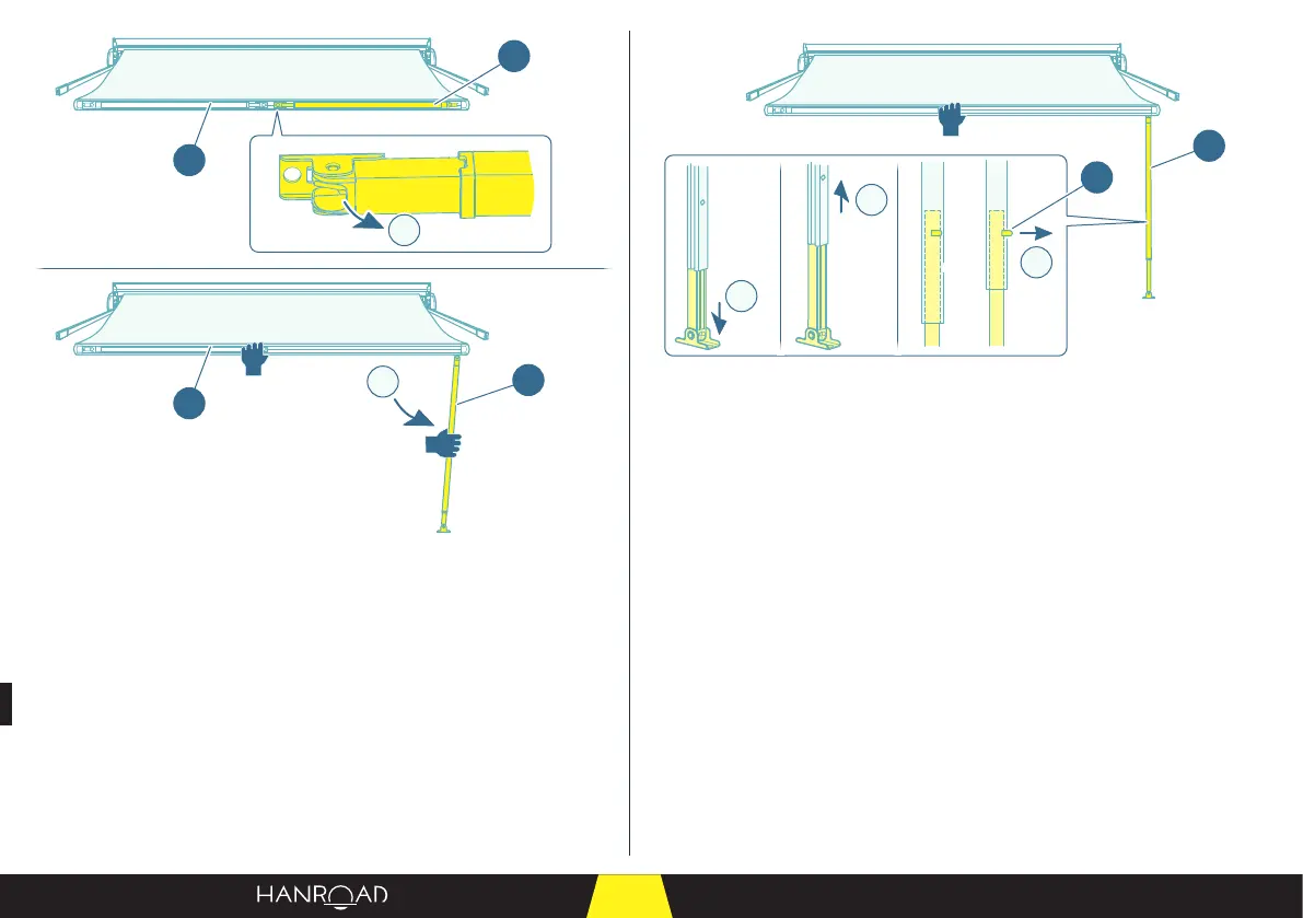 ■ Trek de rechtersteun (2) los het luifeldoek (1).
