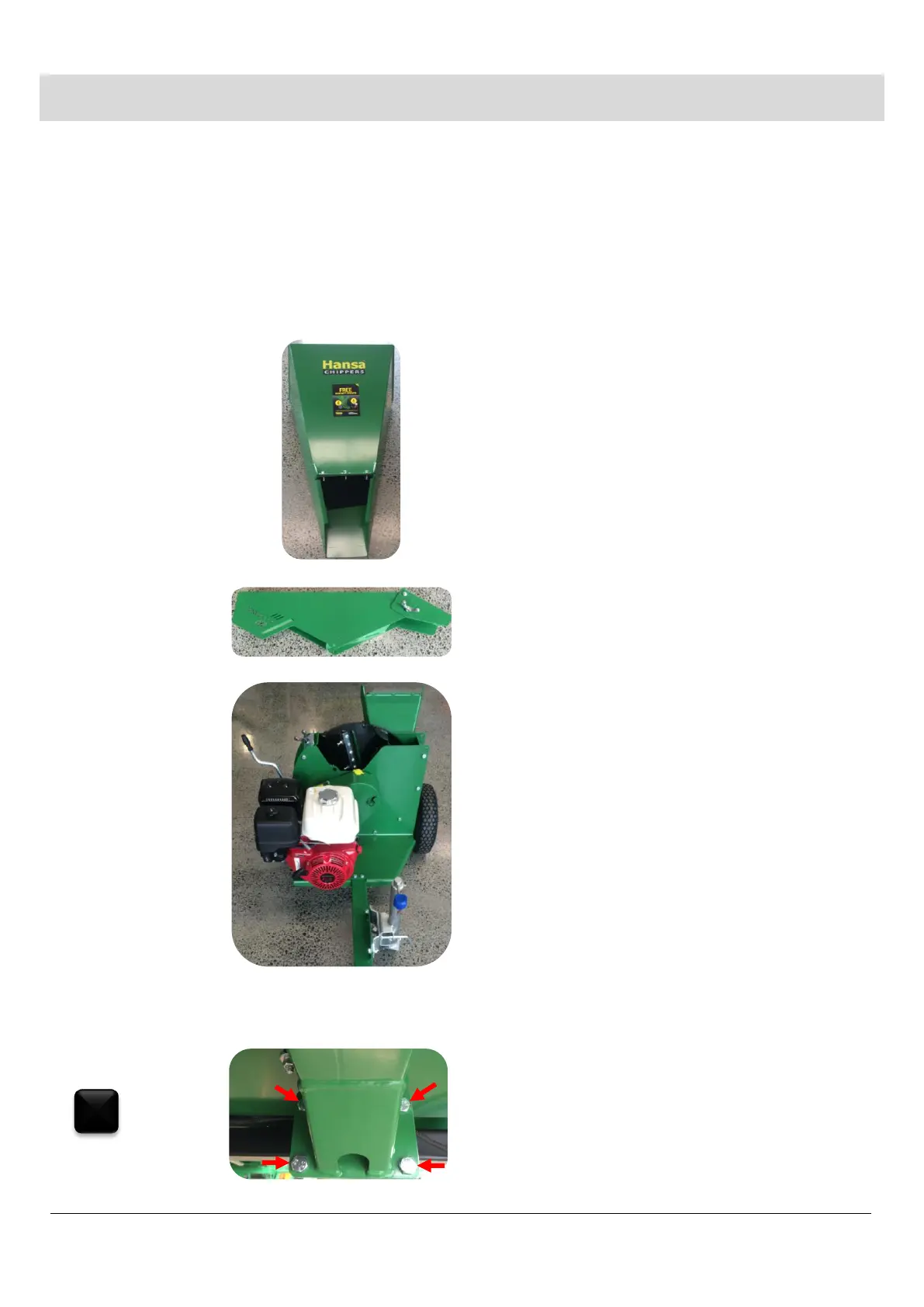 When you receive your Hansa brush chipper, the inlet and outlet chute may not be assembled on the chipper. All the fasteners